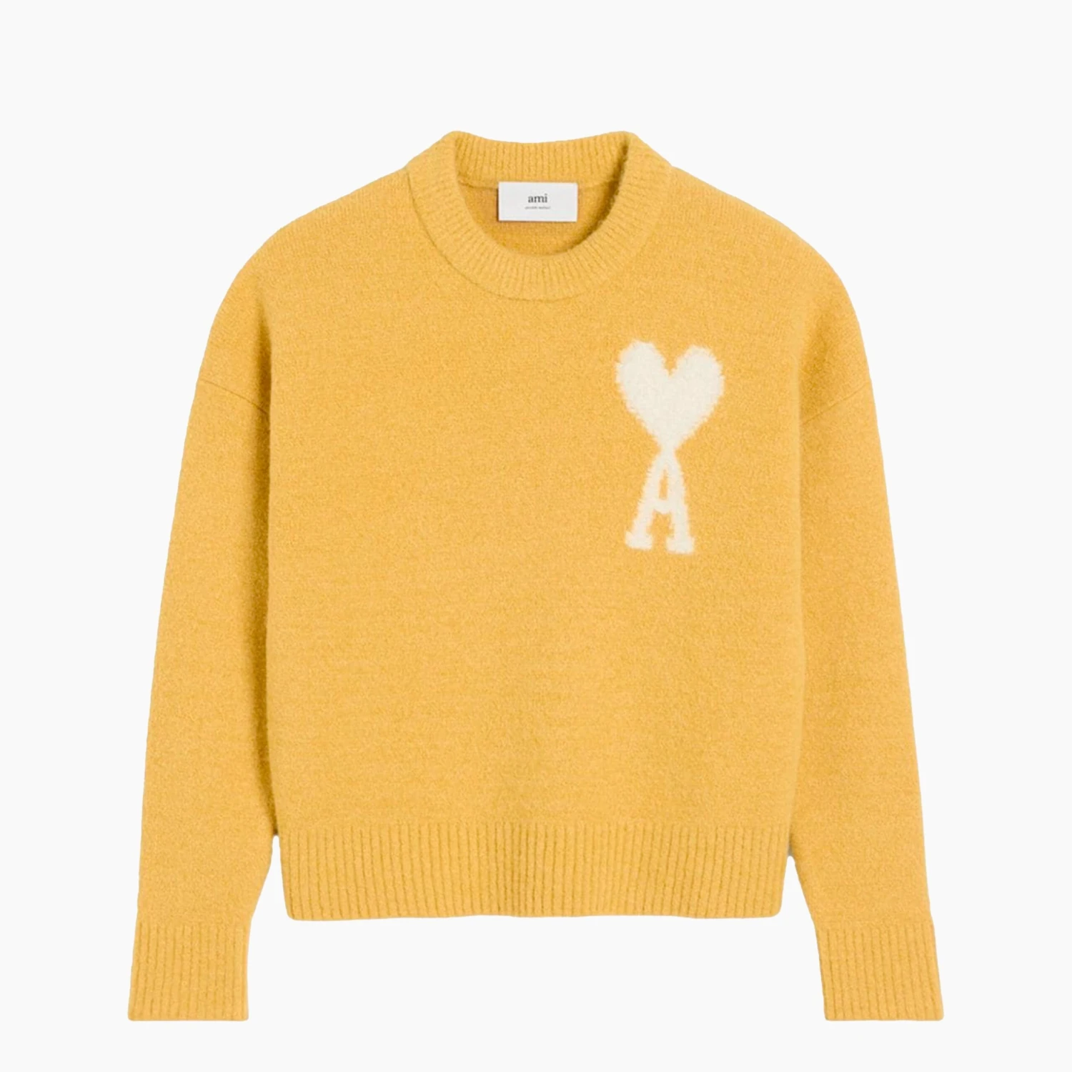Le pull à col rond Ami de Coeur moutarde en maille texturée en alpaga signé Ami Paris arbore le logo emblématique Ami de Coeur délicatement brodé en blanc sur le côté gauche de la poitrine à l’avant.