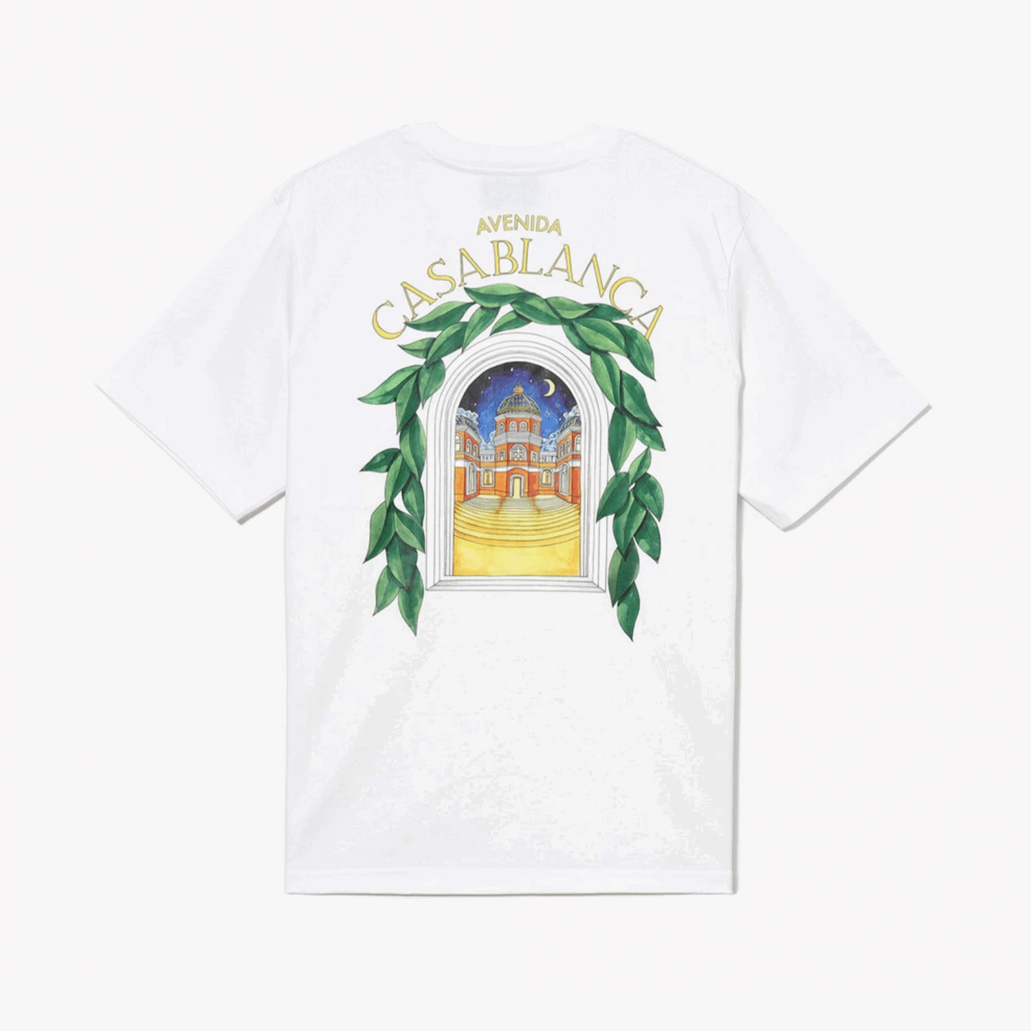 Le Casablanca T-Shirt Avenida Blanc est confectionné en coton premium et présente un design imprimé à l’avant et au dos. Sur le côté gauche de la poitrine, on retrouve une illustration d’un arc bordé de feuilles vertes, avec en son centre un bâtiment illuminé sous un ciel étoilé. Le dos du t-shirt dévoile une version agrandie et détaillée de ce visuel, enrichissant la composition artistique. L’inscription « AVENIDA CASABLANCA » encadre le motif, apportant une signature graphique élégante. C’est une pièce forte qui mêle inspiration architecturale et esthétique méditerranéenne.