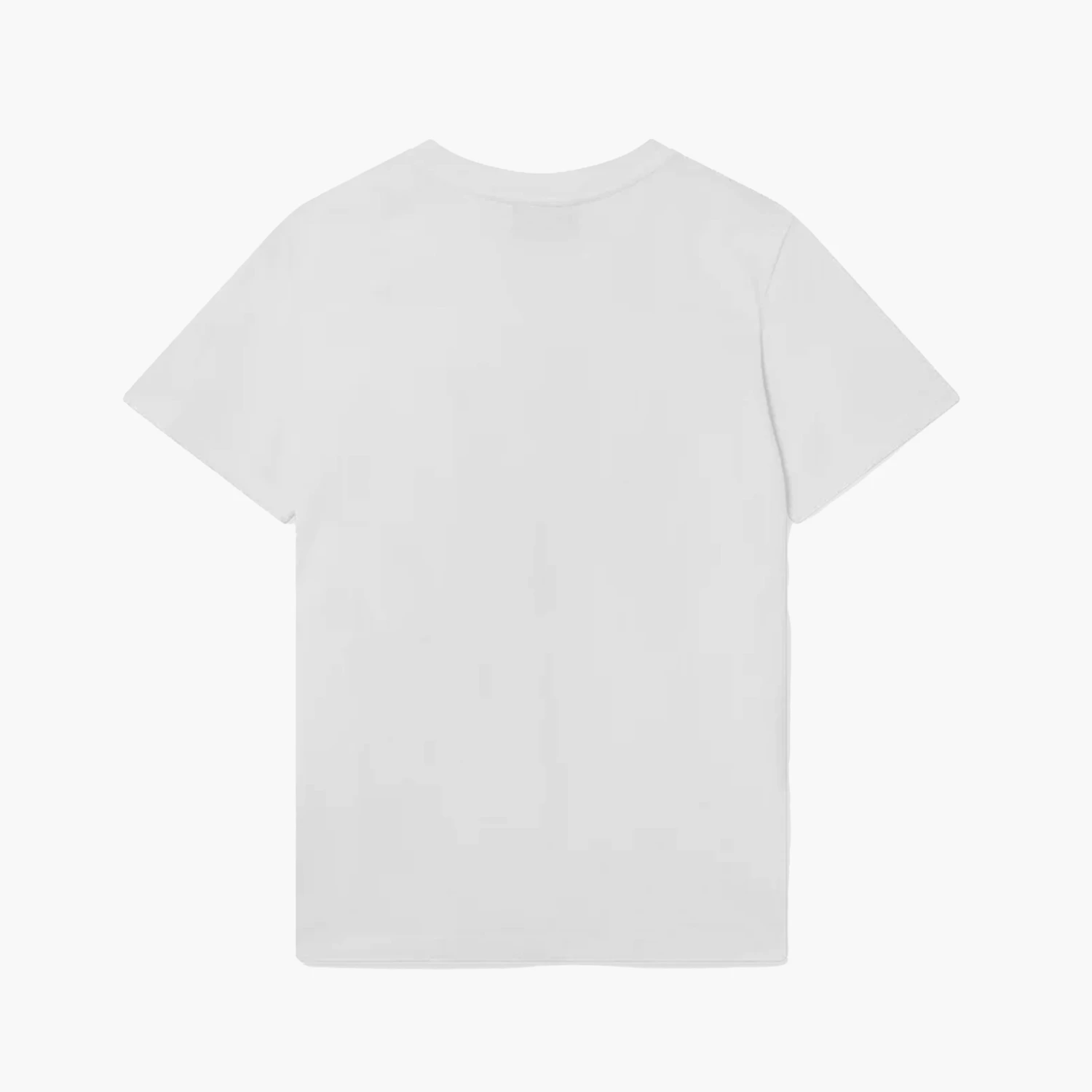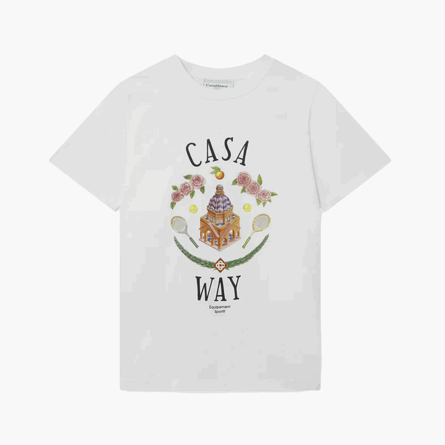 Ce t-shirt Casa Way blanc en coton signé Casablanca présente à l’avant un design coloré représentant un bâtiment stylisé, entouré de raquettes de tennis et de feuilles de laurier. Les mots « CASA » et « WAY » encadrent l’image, complétant ce motif vibrant et thématique.