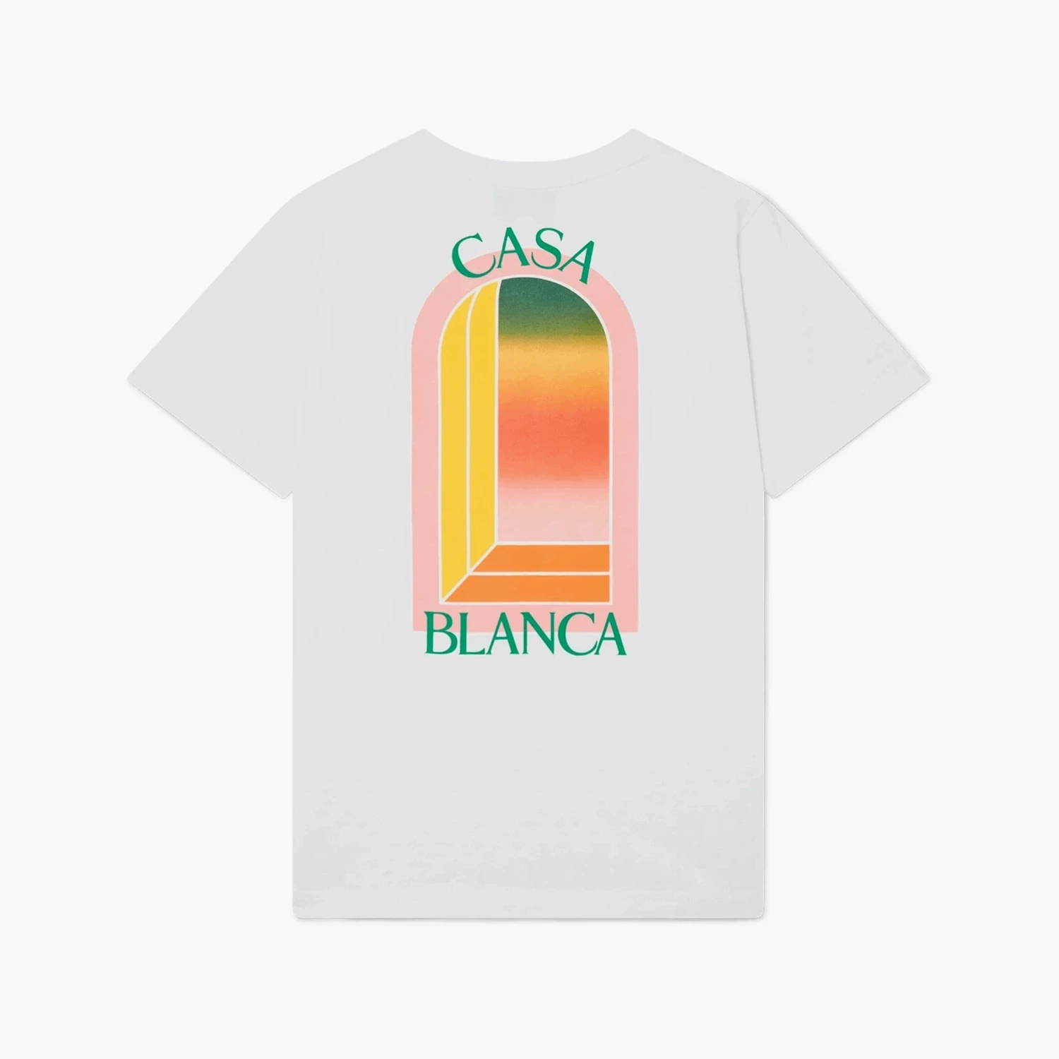 Le t-shirt Gradient L’Arche blanc en coton signé Casablanca arbore un motif coloré et lumineux sur le côté gauche de la poitrine à l’avant, ainsi qu’en grand format au dos. Le design présente une arche représentée dans un dégradé de couleurs vives, évoquant un coucher ou lever de soleil, encadrée par le nom « CASA BLANCA » en lettres stylisées.