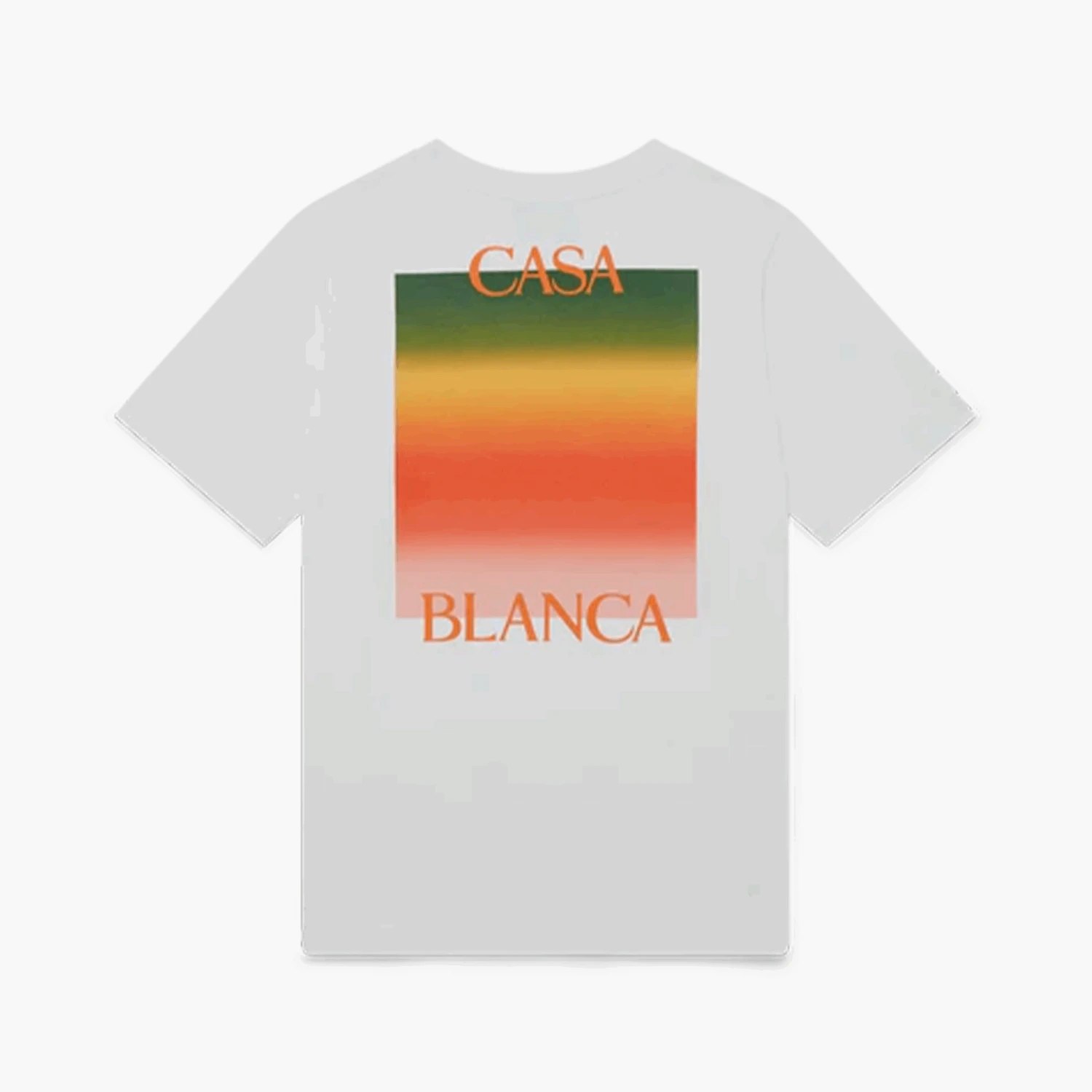 Le t-shirt « Casablanca Gradient Logo Blanc » offre un design minimaliste et raffiné. Conçu en coton blanc de haute qualité, il arbore un imprimé dégradé aux tons orangés et verts, rappelant un coucher de soleil chaleureux. À l’avant, un petit motif centralisé combine le logo « Casa Blanca » avec ce dégradé subtil. Au dos, le même design est agrandi, ajoutant un effet visuel captivant. Ce modèle combine élégance et simplicité, parfait pour un style décontracté mais sophistiqué.