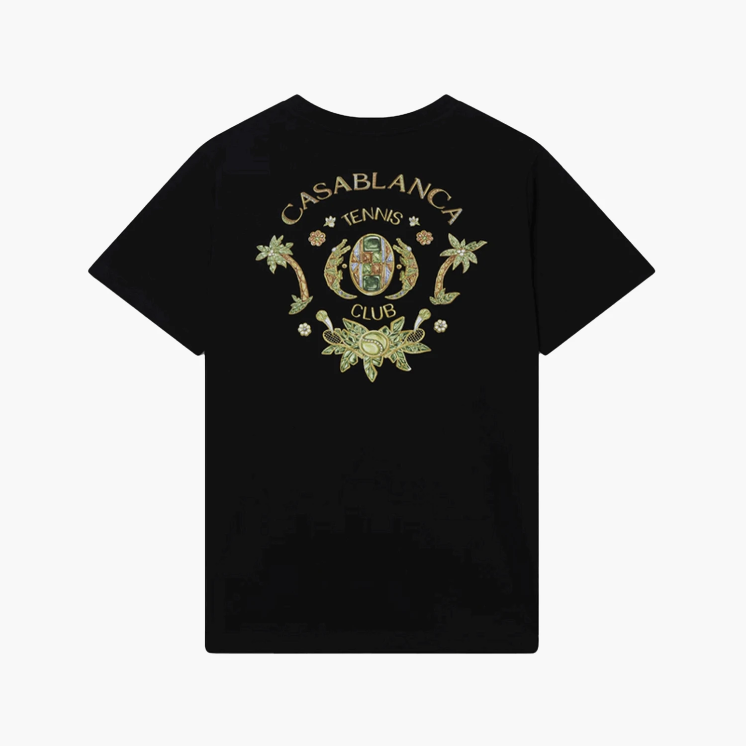 Le t-shirt Joyaux D’Afrique Tennis Club noir en coton de Casablanca arbore à l’avant, sur le côté gauche de la poitrine, et au dos, un design captivant du Tennis Club. Ce motif est richement décoré de palmiers et de joyaux inspirés par l’Afrique, créant une œuvre d’art visuelle qui mêle le sport à des éléments naturels et culturels exotiques. Le dos du t-shirt présente une version plus grande et plus détaillée de ce même design.