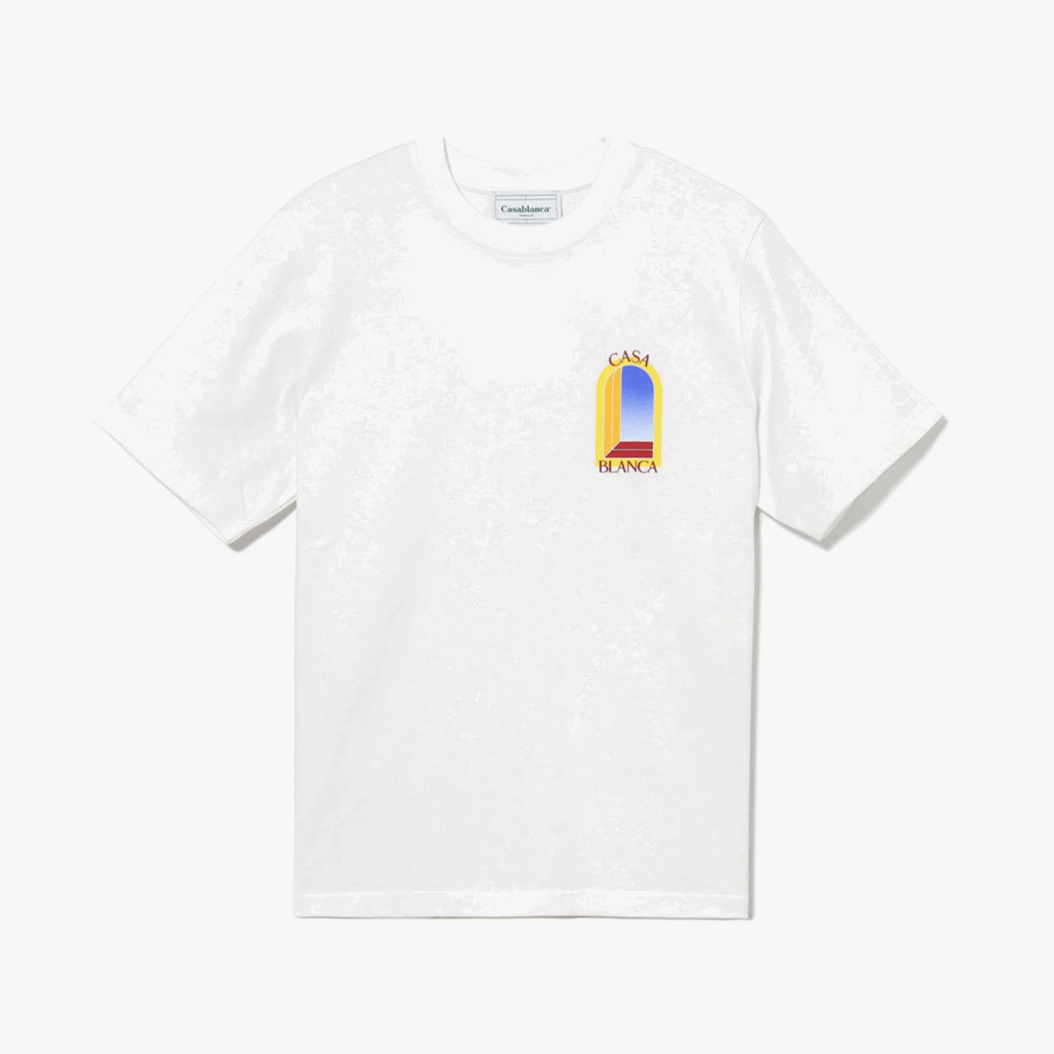 Le Casablanca T-Shirt L’Arche De Jour Blanc est confectionné en coton blanc de qualité. Il se distingue par un motif d’arche colorée sur la poitrine, combinant des teintes de jaune, rouge et bleu ciel. Au dos, une grande illustration du même motif capte l’attention, renforçant l’identité visuelle du t-shirt. Le design est encadré par l’inscription “CASA BLANCA” dans une typographie raffinée. Ce t-shirt mêle avec élégance inspiration architecturale et palette lumineuse.