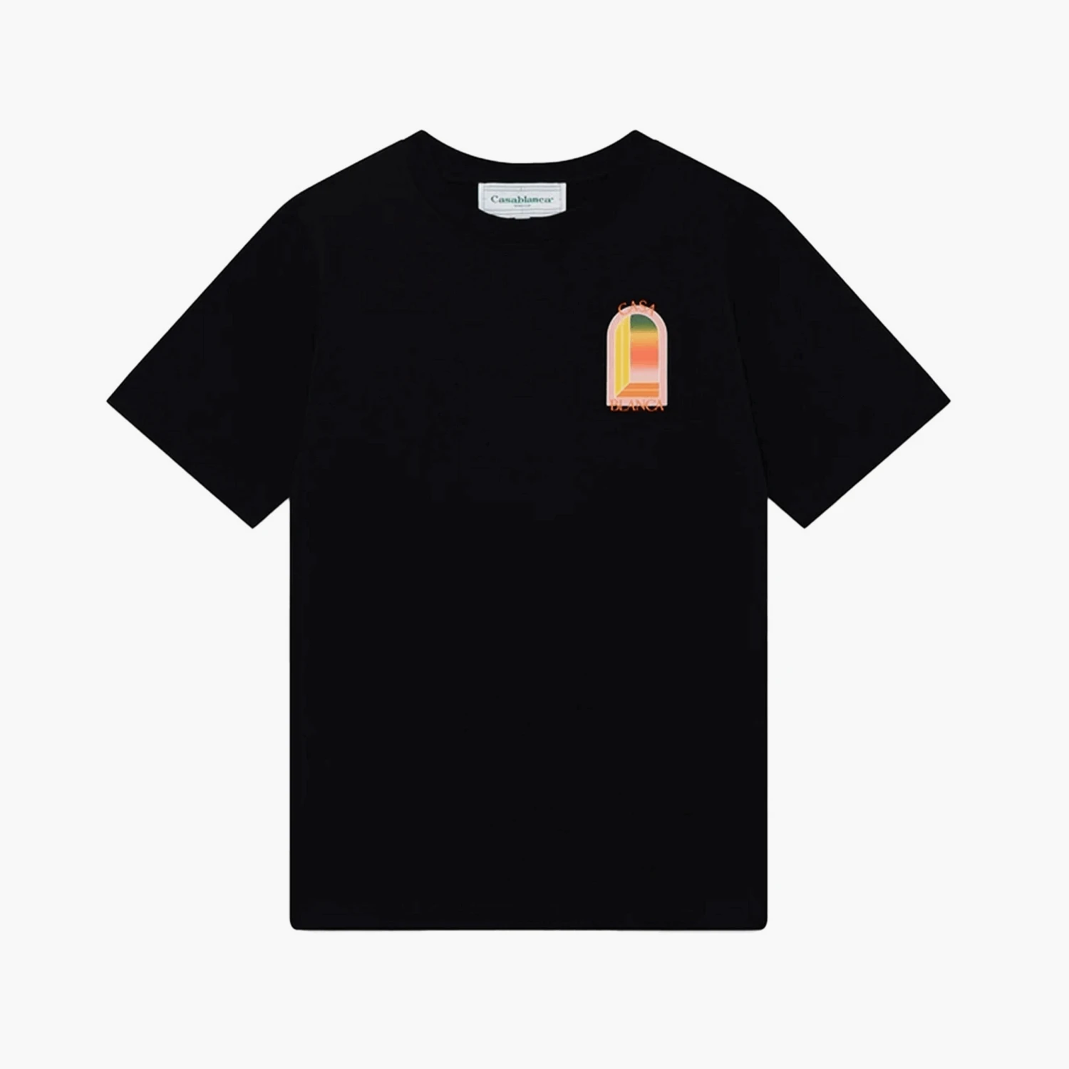 Le t-shirt Gradient L’Arche noir en coton signé Casablanca arbore un motif coloré et lumineux sur le côté gauche de la poitrine à l’avant, ainsi qu’en grand format au dos. Le design présente une arche représentée dans un dégradé de couleurs vives, évoquant un coucher ou lever de soleil, encadrée par le nom « CASA BLANCA » en lettres stylisées.