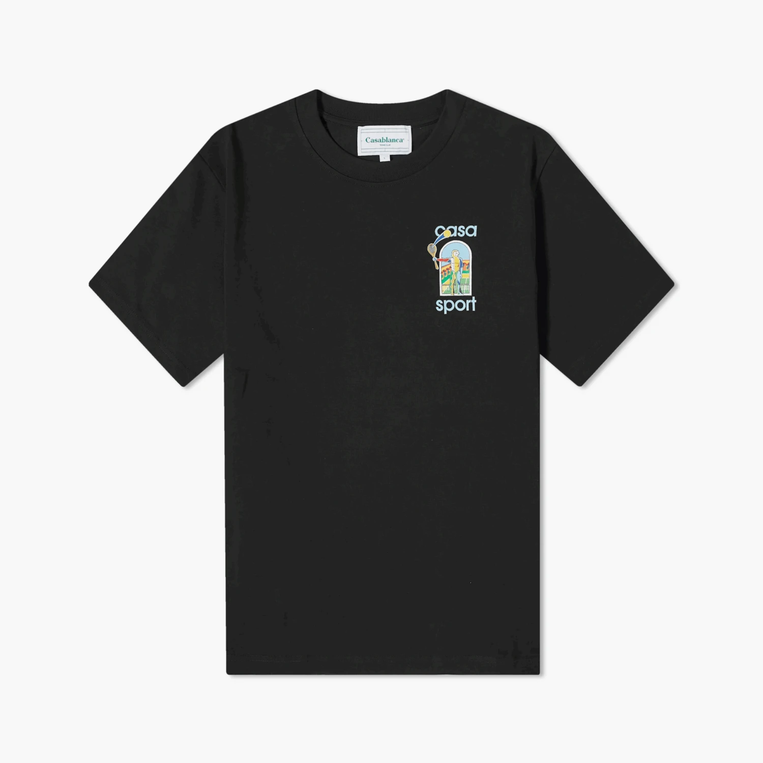 Ce t-shirt Le Jeu de Couleur noir en coton signé Casablanca présente un motif riche sur le côté gauche de la poitrine à l’avant et un design artistique plus élaboré au dos. Alliant fonctionnalité et esthétique, ce t-shirt marie subtilement le sport et l’art.