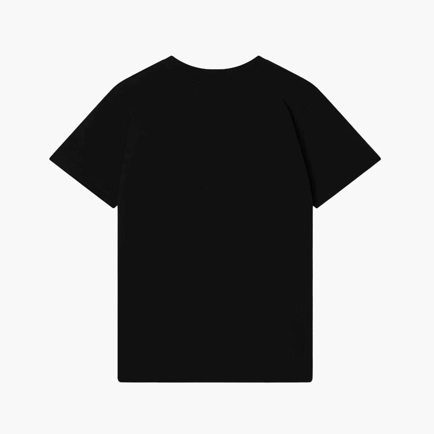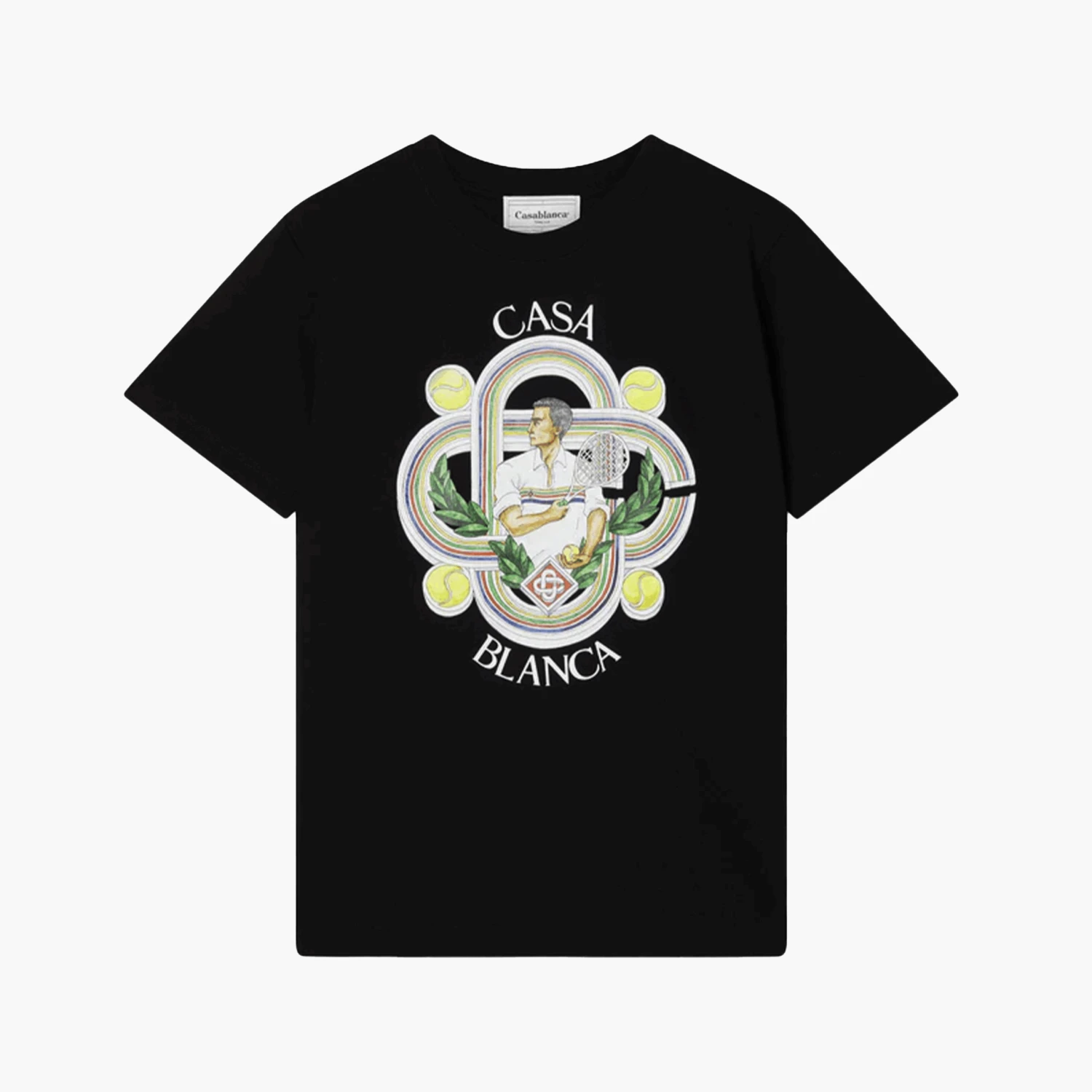 Ce t-shirt Le Joueur noir en coton signé Casablanca arbore un design imprimé sur la poitrine à l’avant, représentant un joueur de tennis entouré de motifs de balles tennis et de feuillage. Celui-ci est encadré par les inscriptions « CASA » et « BLANCA » au-dessus et en dessous.