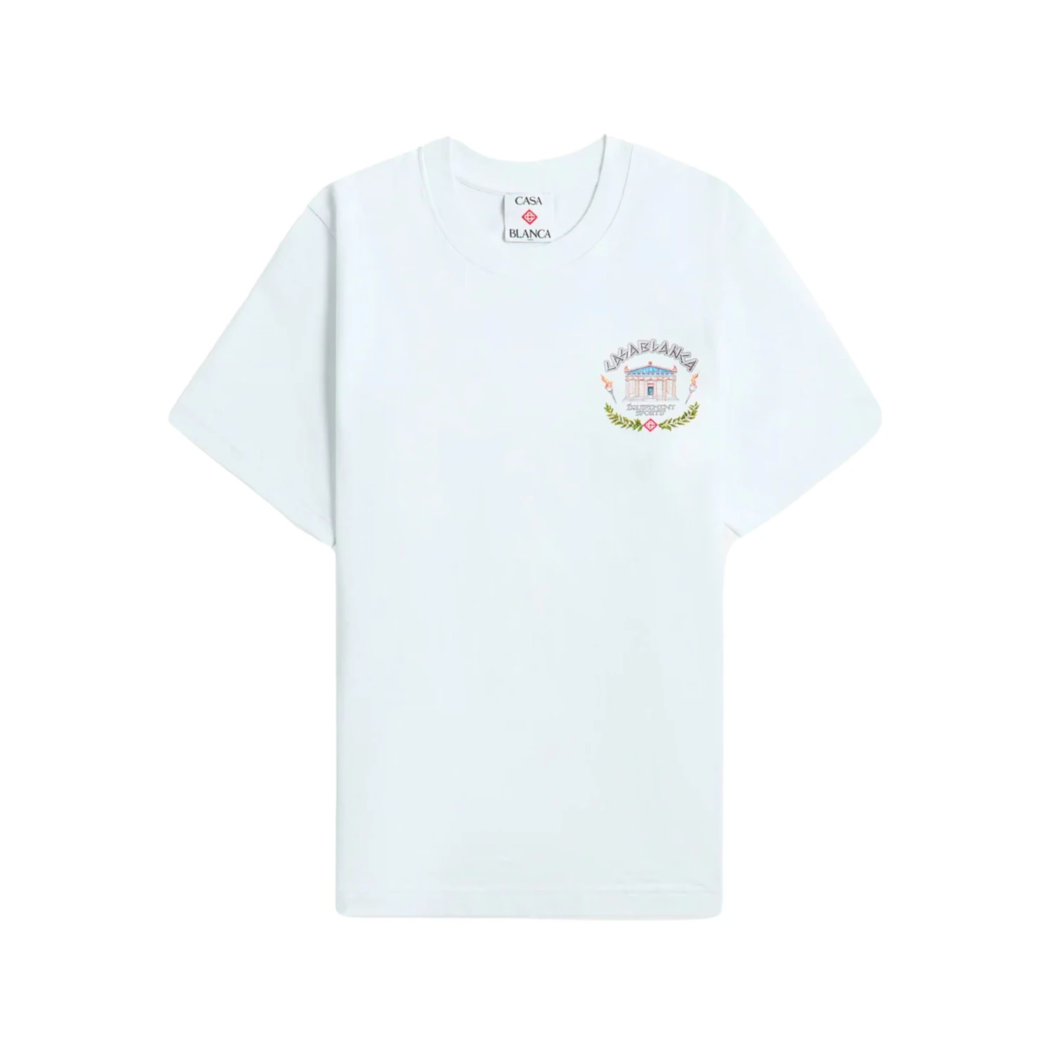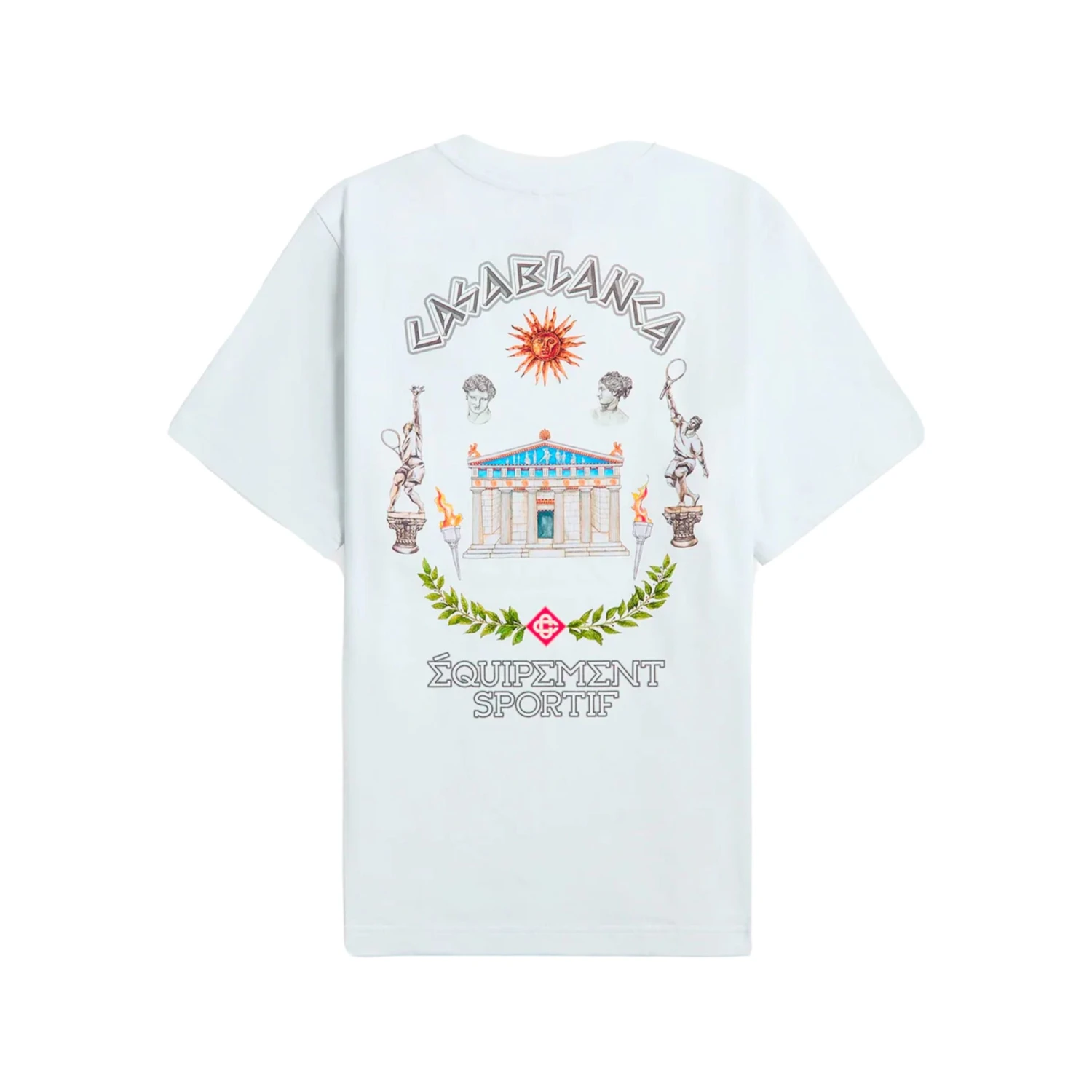 Le T-shirt Casablanca Le Temple Du Sport blanc est une pièce emblématique au design richement illustré. Il arbore un motif graphique au dos représentant un temple grec entouré de statues, de flammes et d’éléments sportifs, souligné par l’inscription « Casablanca Équipement Sportif ». Sur le devant, un mini imprimé poitrine reprend le même visuel en version réduite. Fabriqué en coton de haute qualité, il allie confort et style avec une touche artistique. C’est un vêtement fort pour une allure luxueuse et décontractée.