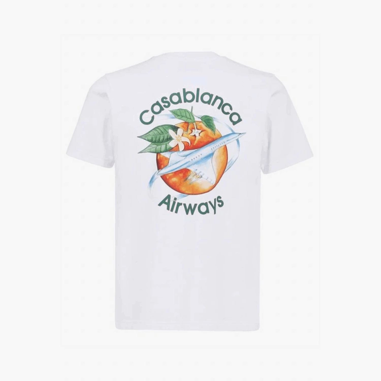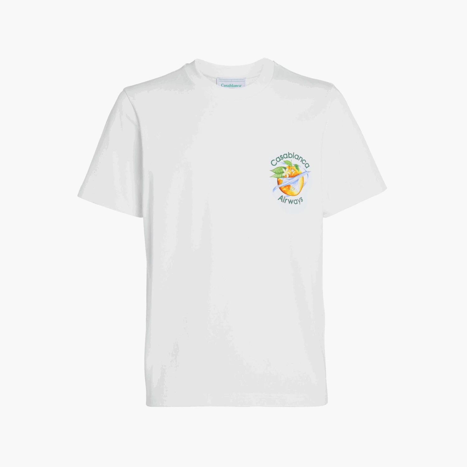 Le t-shirt Orbite Autour De L’Orange blanc en coton signé Casablanca arbore un design imprimé sur le côté gauche de la poitrine à l’avant, représentant une orange avec des feuilles entourée de l’inscription « Casablanca Always ».