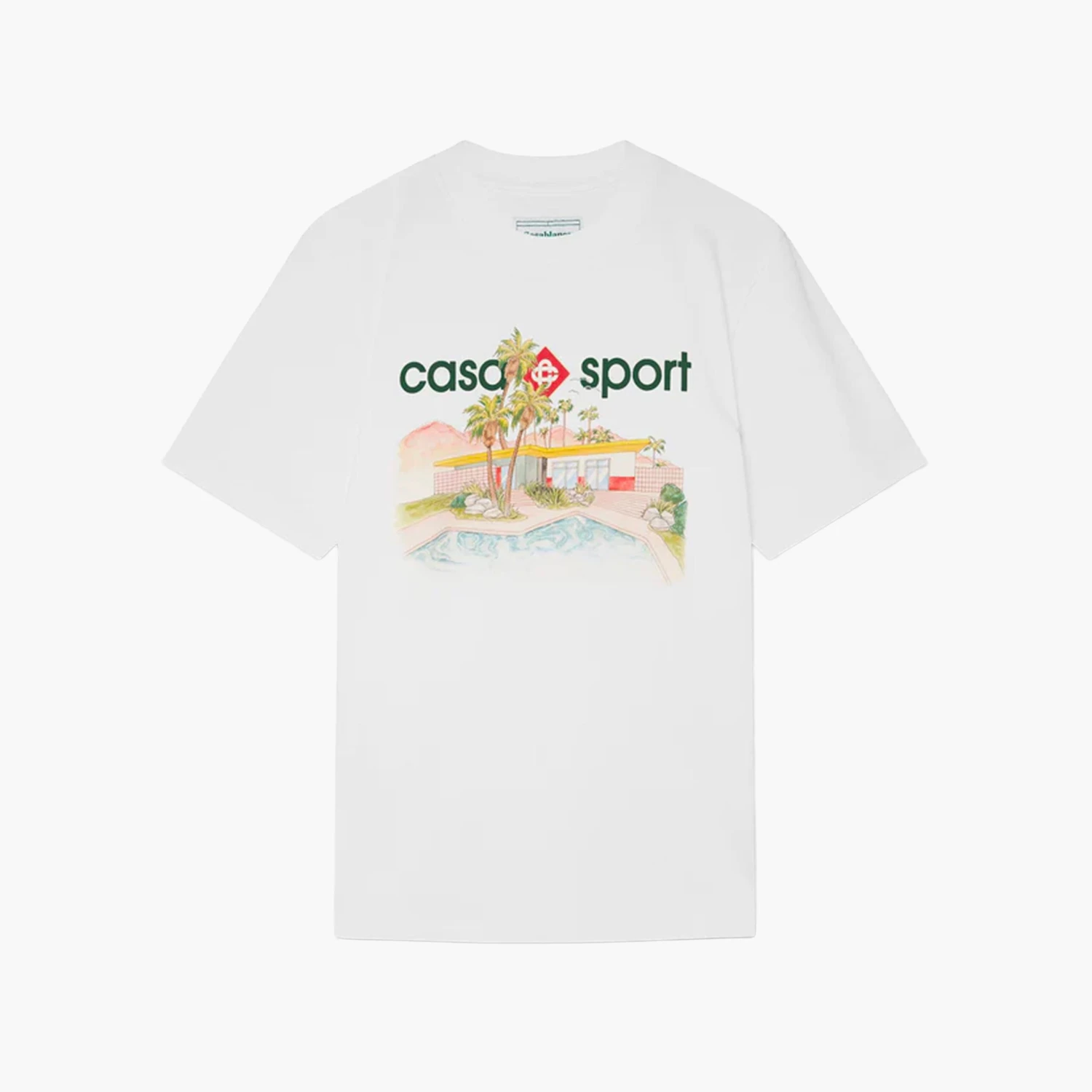 Ce t-shirt Poolside blanc en coton signé Casablanca présente à l’avant un imprimé coloré et détaillé, représentant une scène au bord d’une piscine avec un bâtiment, des palmiers et une vue sur l’eau, accentuée par le logo « casablanca sport« .