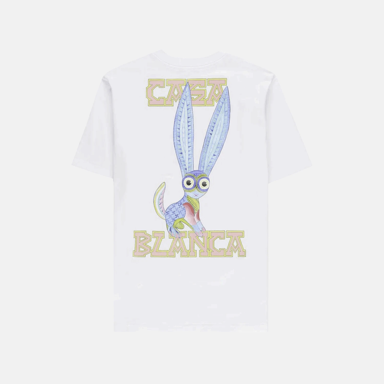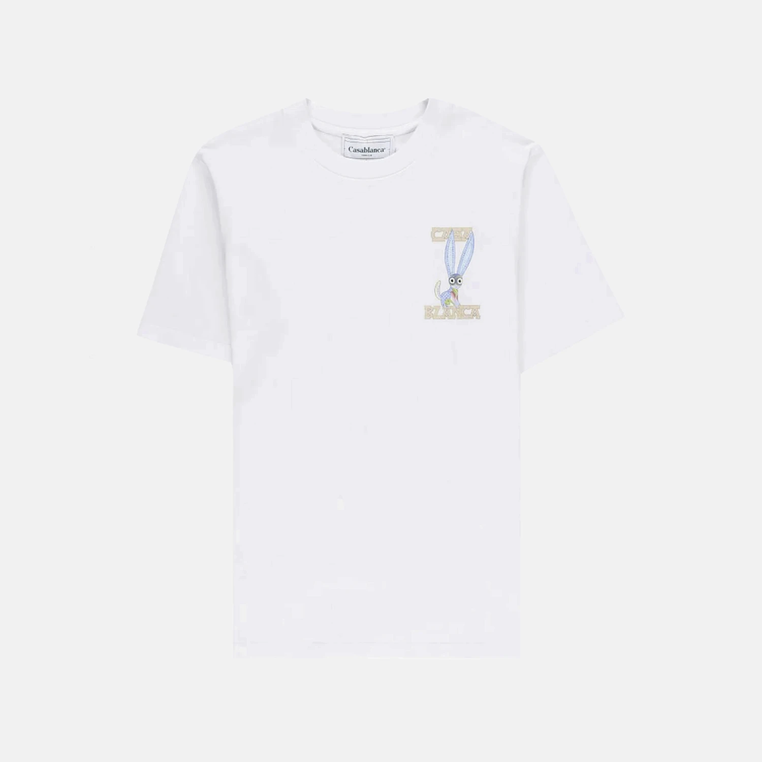 Le T-shirt Souvenir Blanc en coton signé Casablanca présente un motif ludique avec un lapin aux longues oreilles bleues, encadré par le logo de la marque en grandes lettres dorées au dos. À l’avant, un motif similaire mais plus discret orne le côté gauche de la poitrine.