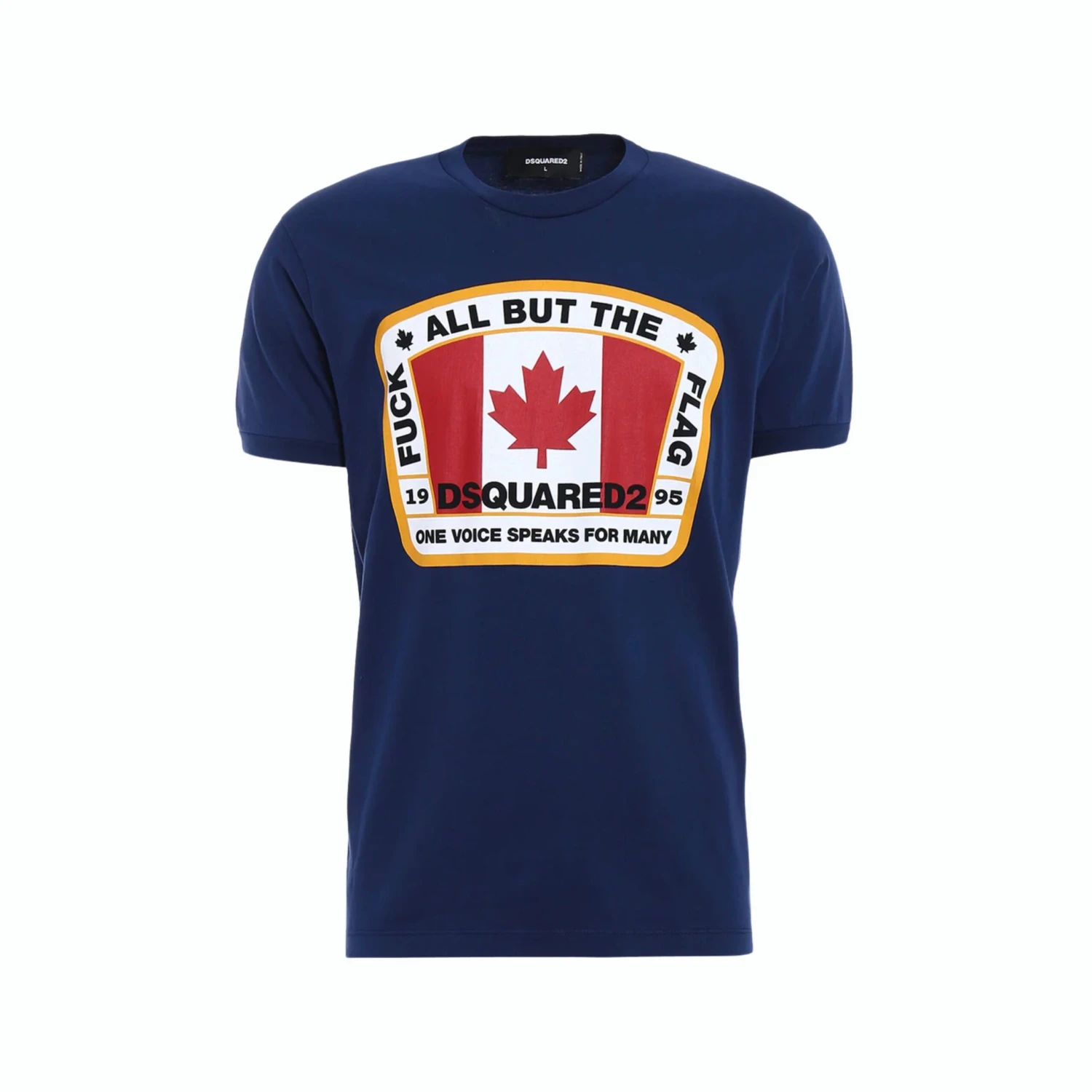 Ce t-shirt bleu en coton signé Dsquared arbore un grand imprimé au centre avec un drapeau canadien stylisé, entouré du slogan « Fuck All But The Flag » et l’inscription « One Voice Speaks for Many » en dessous.