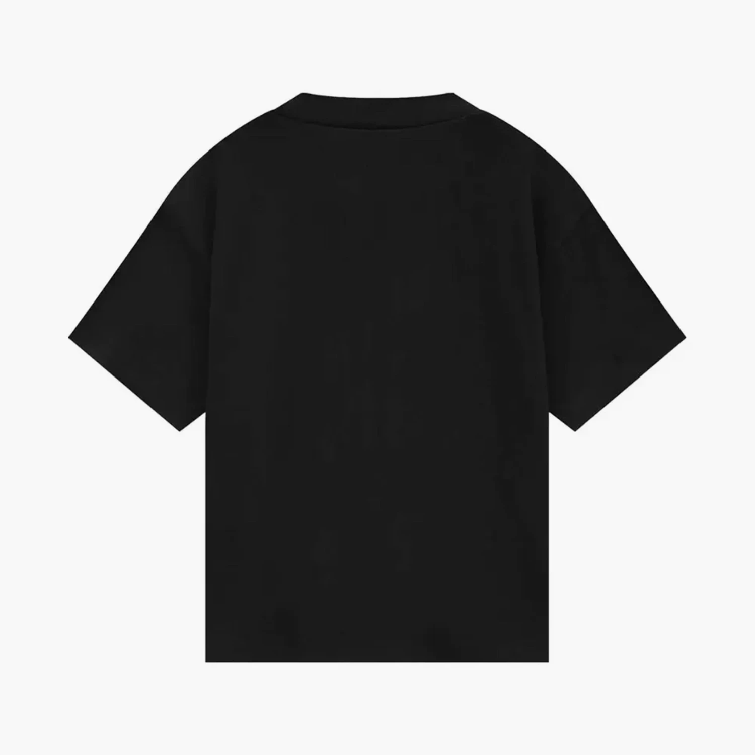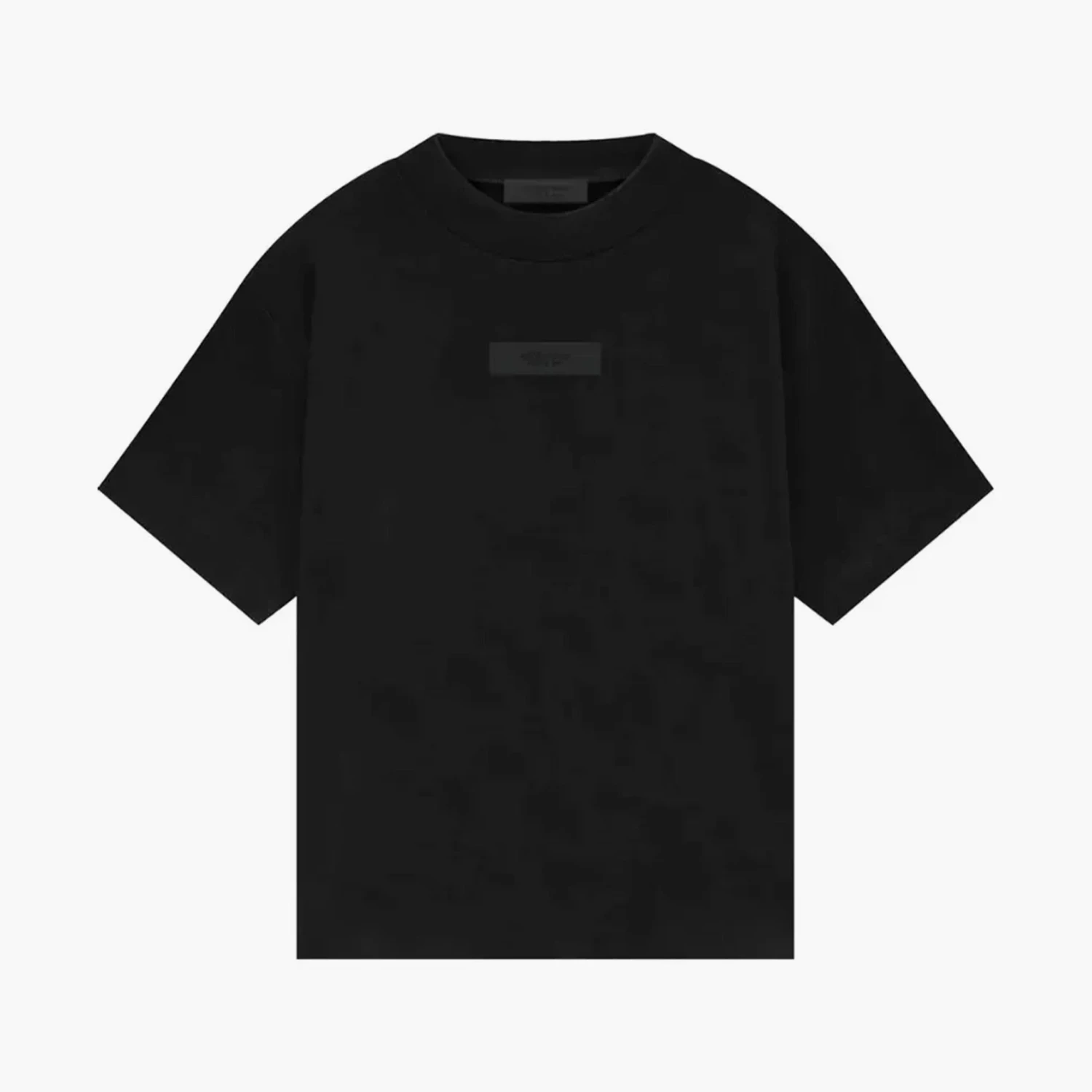 Le t-shirt noir en coton signé Essentials Fear of God arbore le logo emblématique imprimé ton sur ton sur la poitrine à l’avant et comprend une étiquette caoutchoutée au dos.