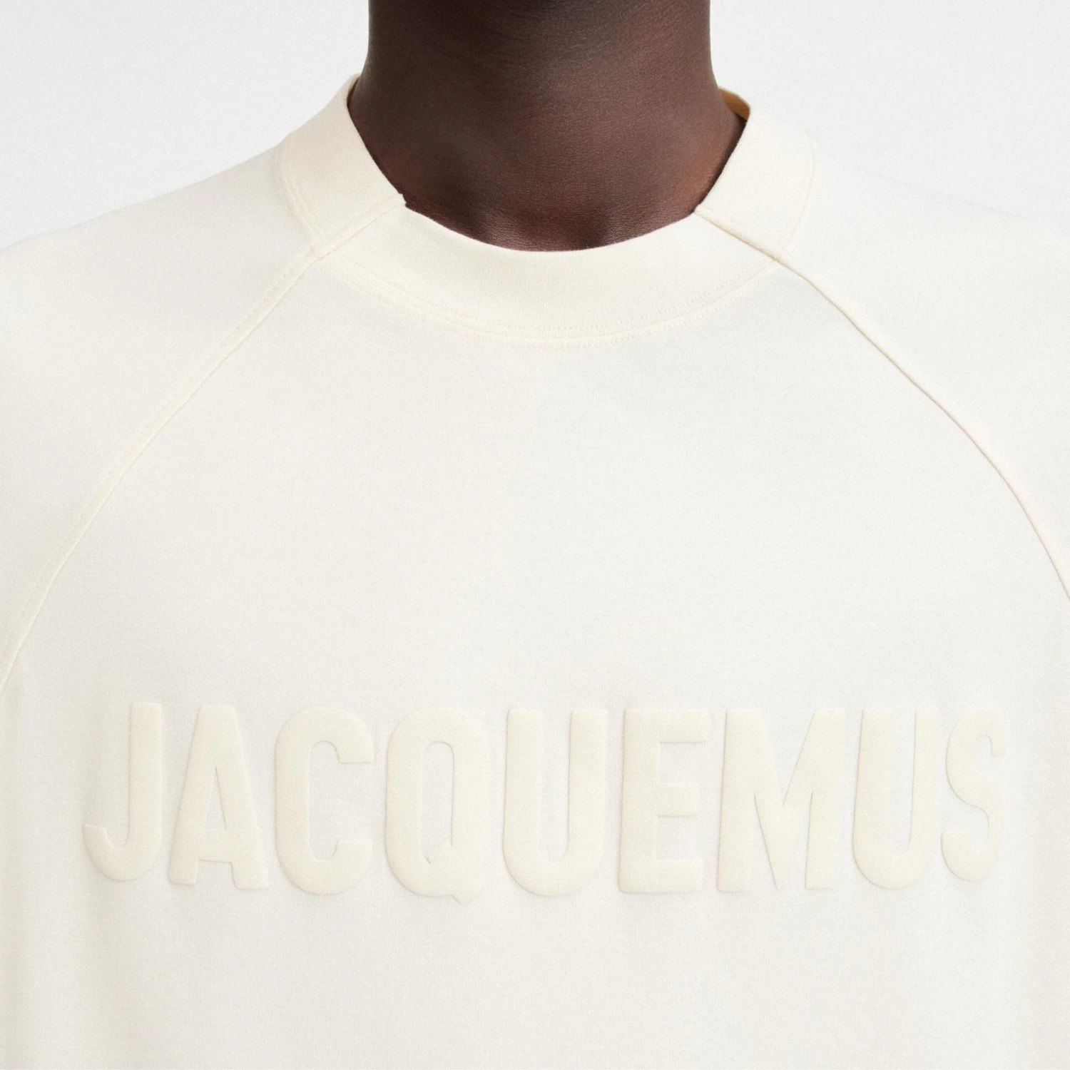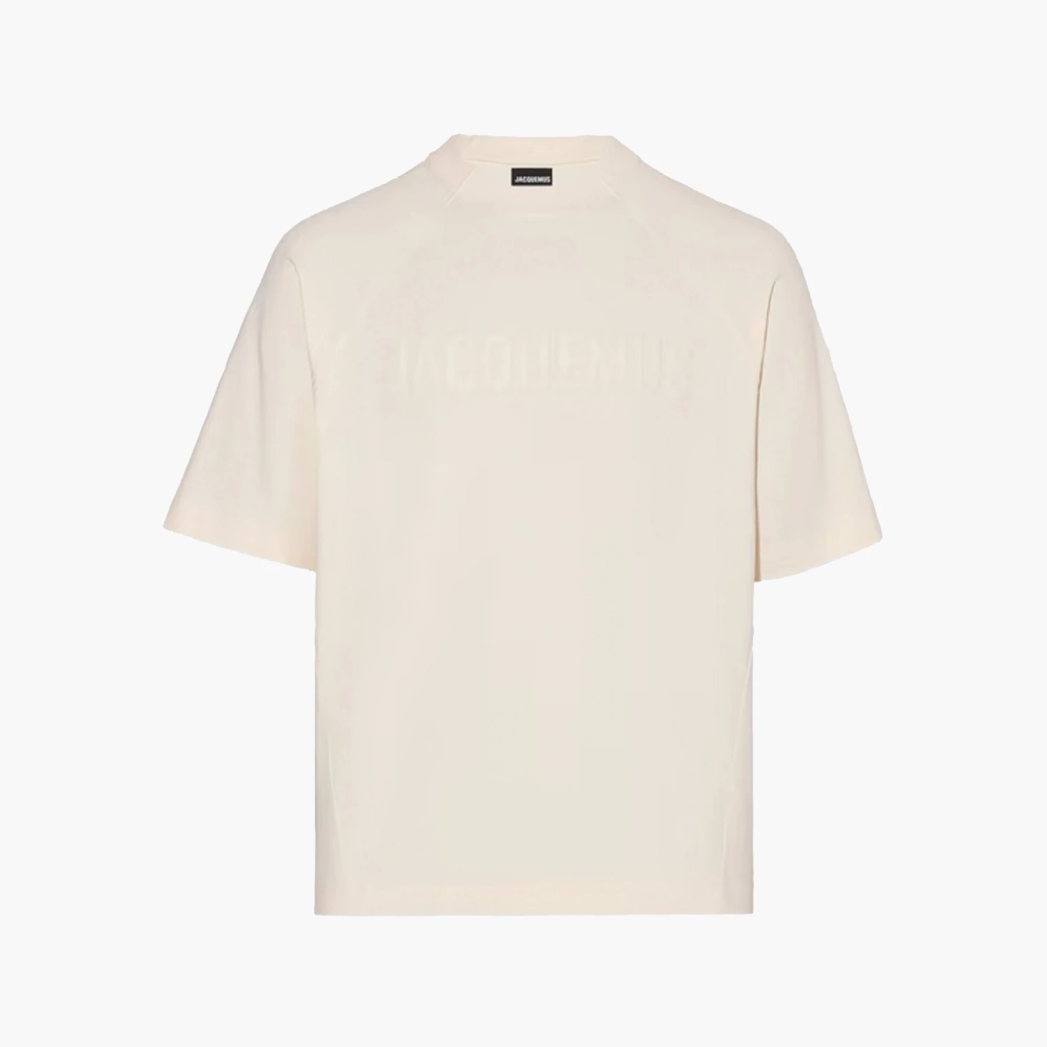 T-shirt beige avec imprimé Jacquemus en majuscule sur le devant.