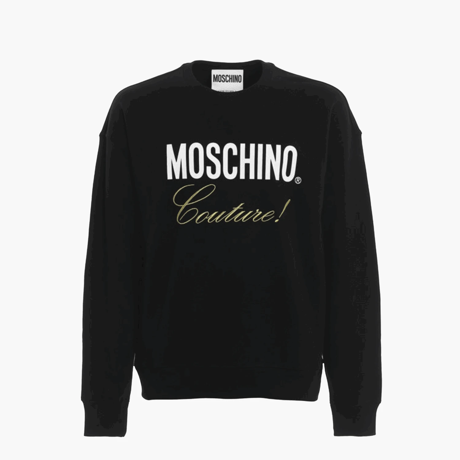Ce pull noir en coton signé Moschino arbore le logo « MOSCHINO Couture! » brodé en blanc et en or sur la poitrine à l’avant.