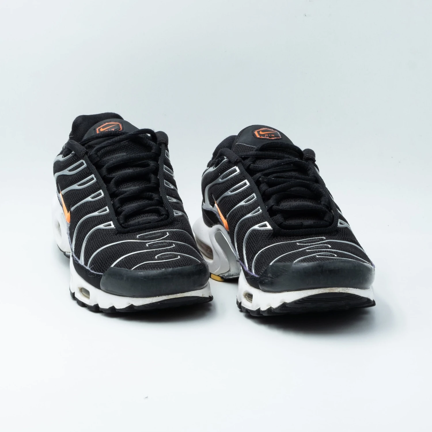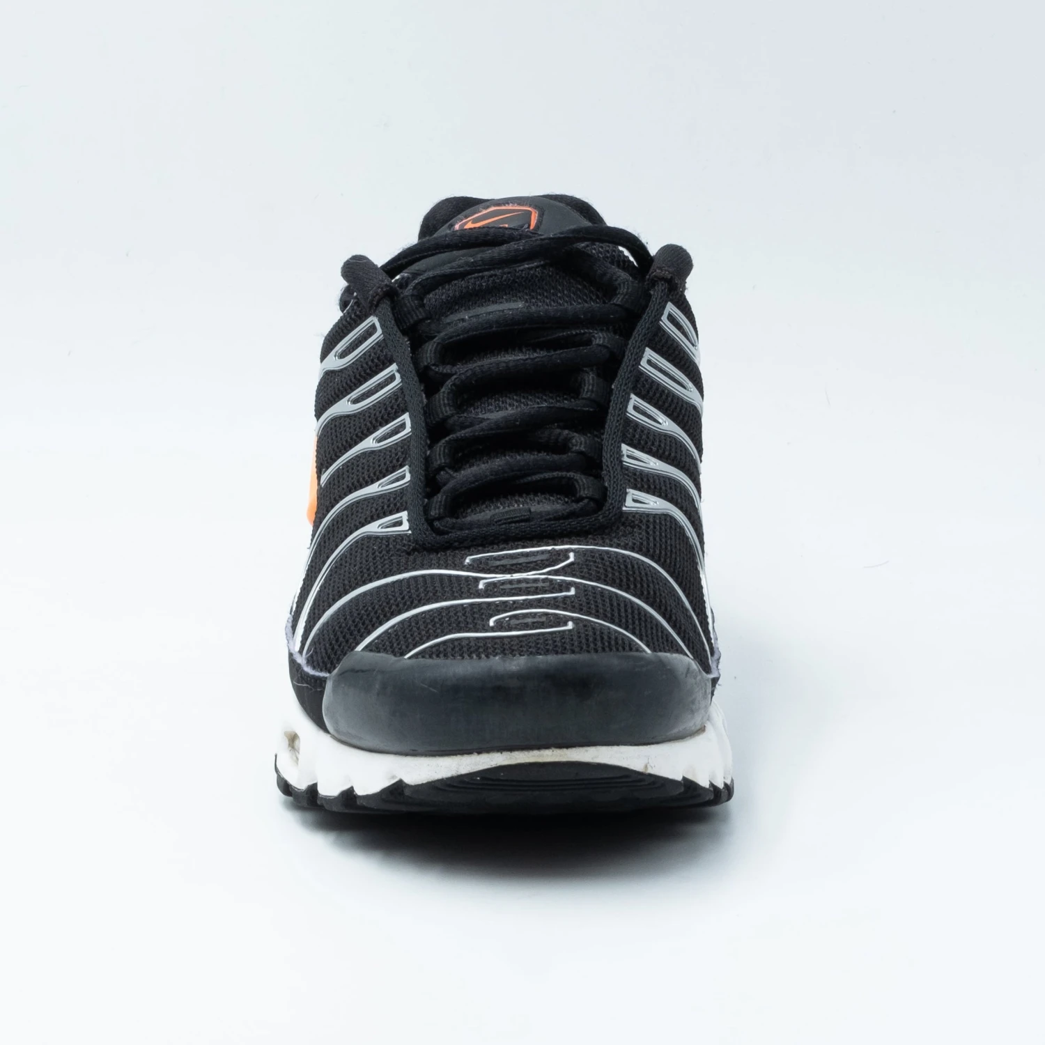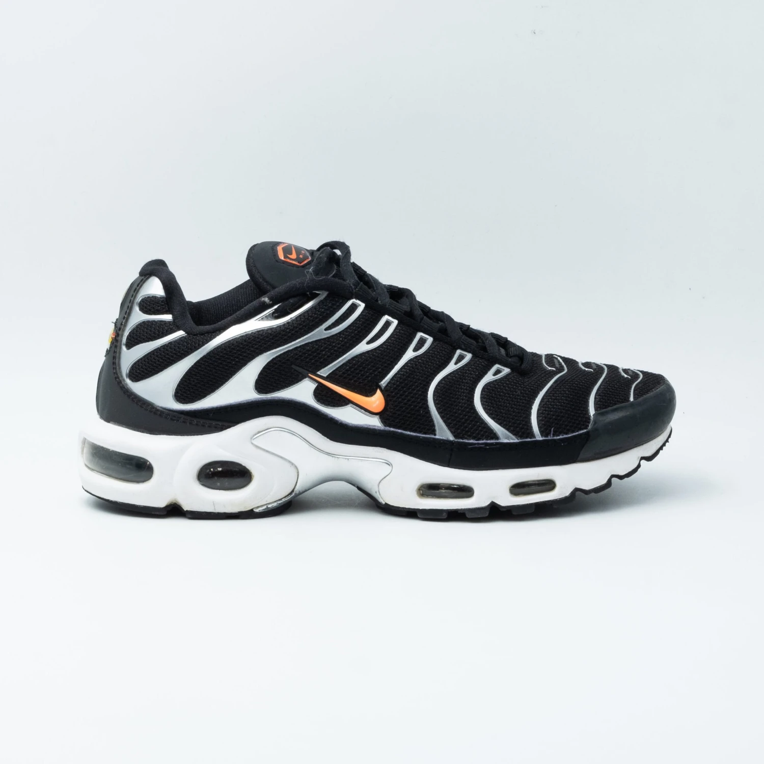 La Nike Air Max Plus Black ‘Dark Grey Hyper Crimson’ présente une tige en mesh noir entourée de la célèbre cage qui recouvre toute la silhouette, du bout du pied au talon. Le noir continue sur le pare-boue en cuir verni, tandis que le branding orange apparaît sur la languette et le côté. En dessous, la chaussure conserve son héritage en tant que première Air Max à intégrer l’Air Tuned