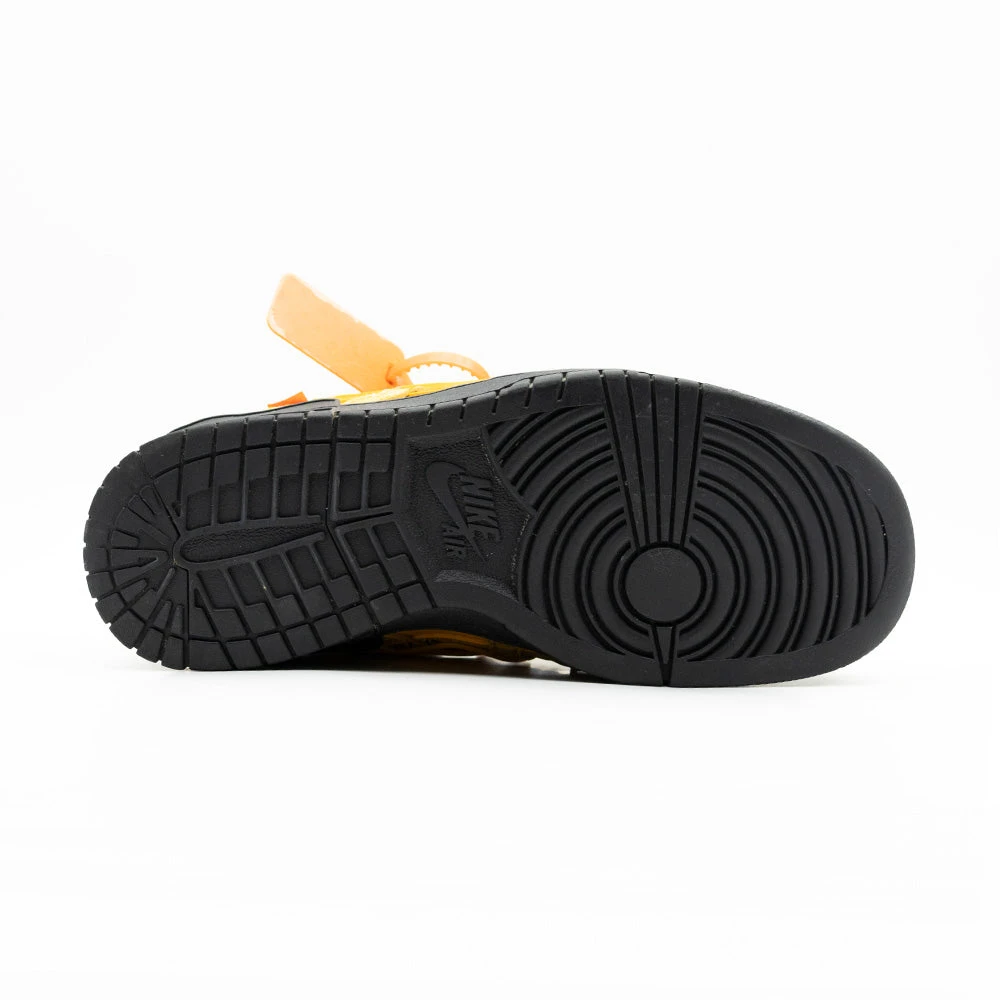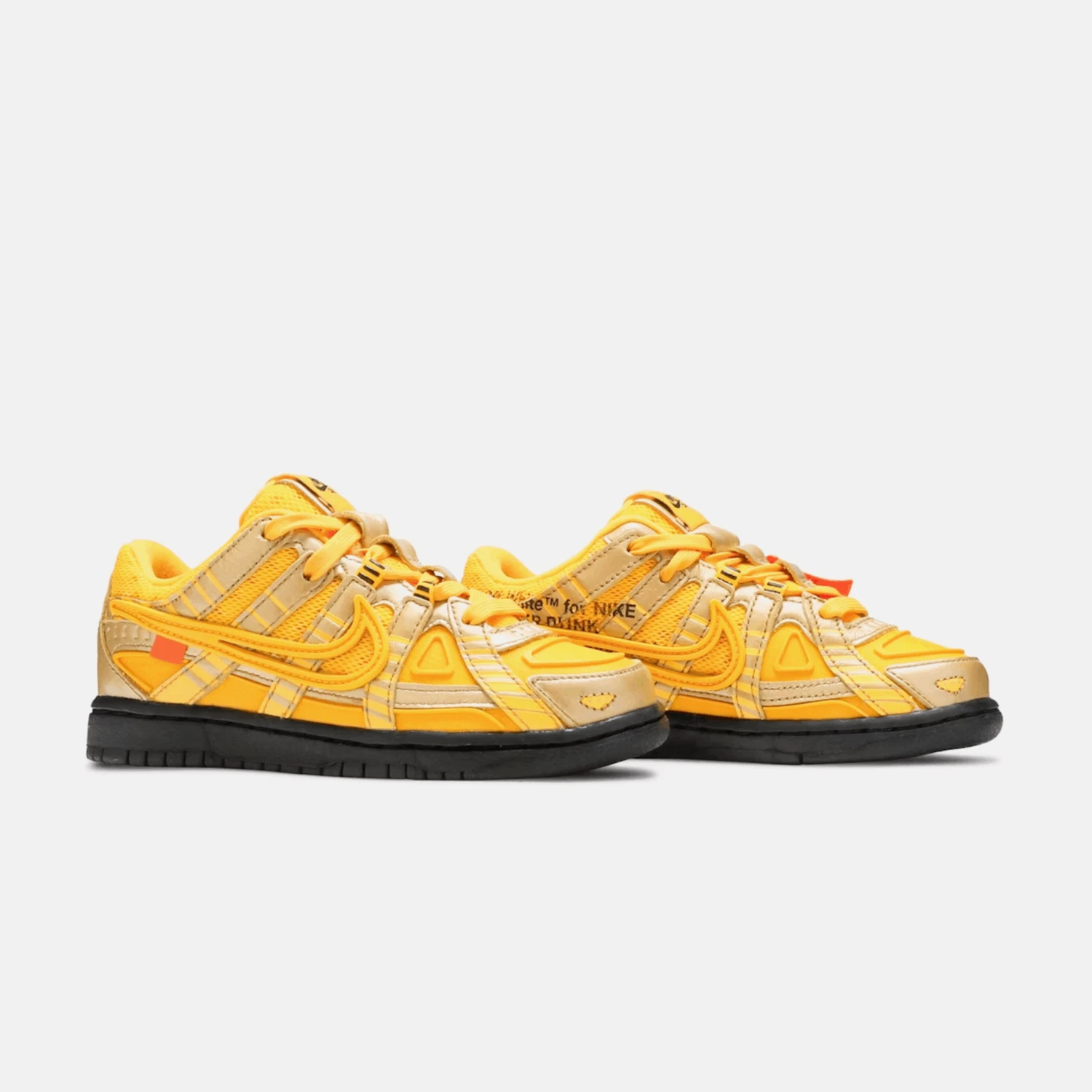 La Off-White x Nike Air Rubber Dunk ‘University Gold’, réalisée en collaboration avec la marque de streetwear de luxe de Virgil Abloh, présente une refonte complète de la silhouette rétro, avec une empeigne inspirée du coureur P-6000. Une base en mesh jaune est renforcée par des superpositions en cuir or métallique et un Swoosh souligné. Le marquage noir contrasté, notamment la languette Nike Off et le texte Helvetica de Virgil sur le côté médian, est assorti à une semelle intermédiaire noire solide avec un coussin d’air visible.