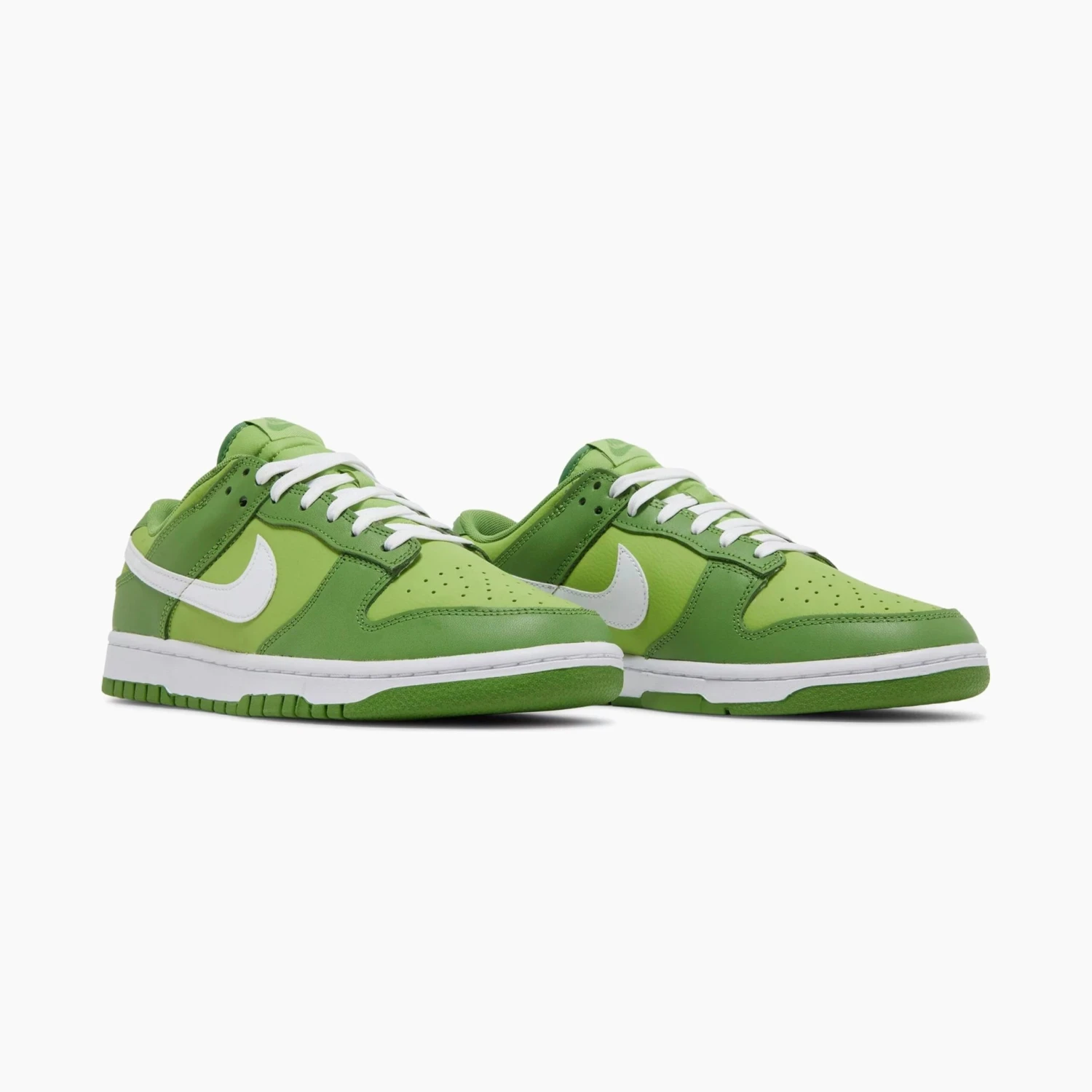 La Nike Dunk Low Chlorophyll arbore une base en cuir vert clair qui se laisse complétée par des superpositions de cuir vert chlorophylle. Plusieurs détails blancs tels que les lacets et le swoosh latéral, adoucissent le tout. Une semelle assortie vient finaliser le design de Peter Moore.