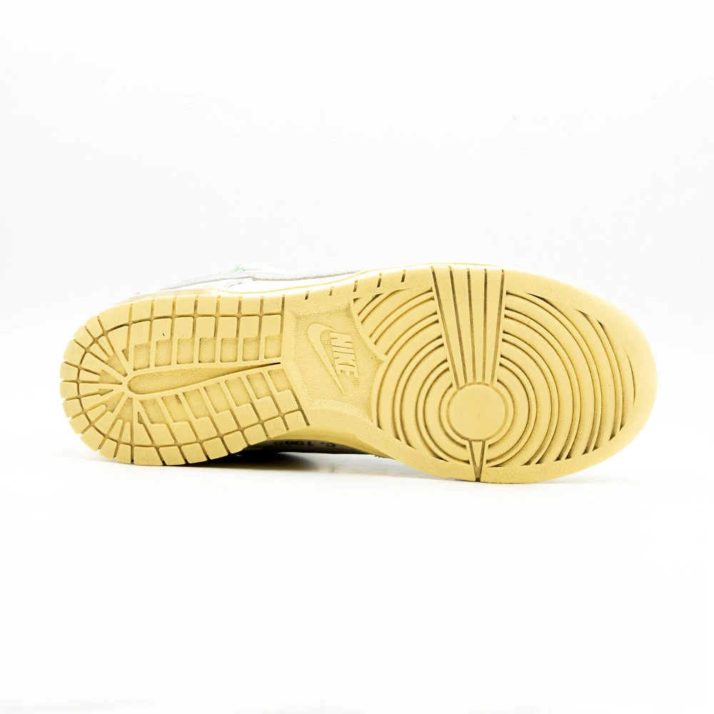 Étiquetée « 01 of 50 », cette édition inaugurale de la Off-White x Nike Dunk Low donne le coup d’envoi de la collection « Dear Summer », avec une tige d’un blanc éclatant composée d’un mélange de toile et de cuir. Un Swoosh argenté traverse le panneau latéral, tandis que des lacets en corde supplémentaires zigzaguent sur la tige, passant par des câbles Flywire intégrés qui émergent d’œillets stratégiquement placés. La semelle intermédiaire pré-jaunie et la languette en mousse exposée confèrent à la chaussure une esthétique vintage. La signature de Virgil Abloh se traduit par une fermeture éclair en plastique blanc, une étiquette décentrée sur la languette et des lignes de texte en Helvetica sur le côté médial.