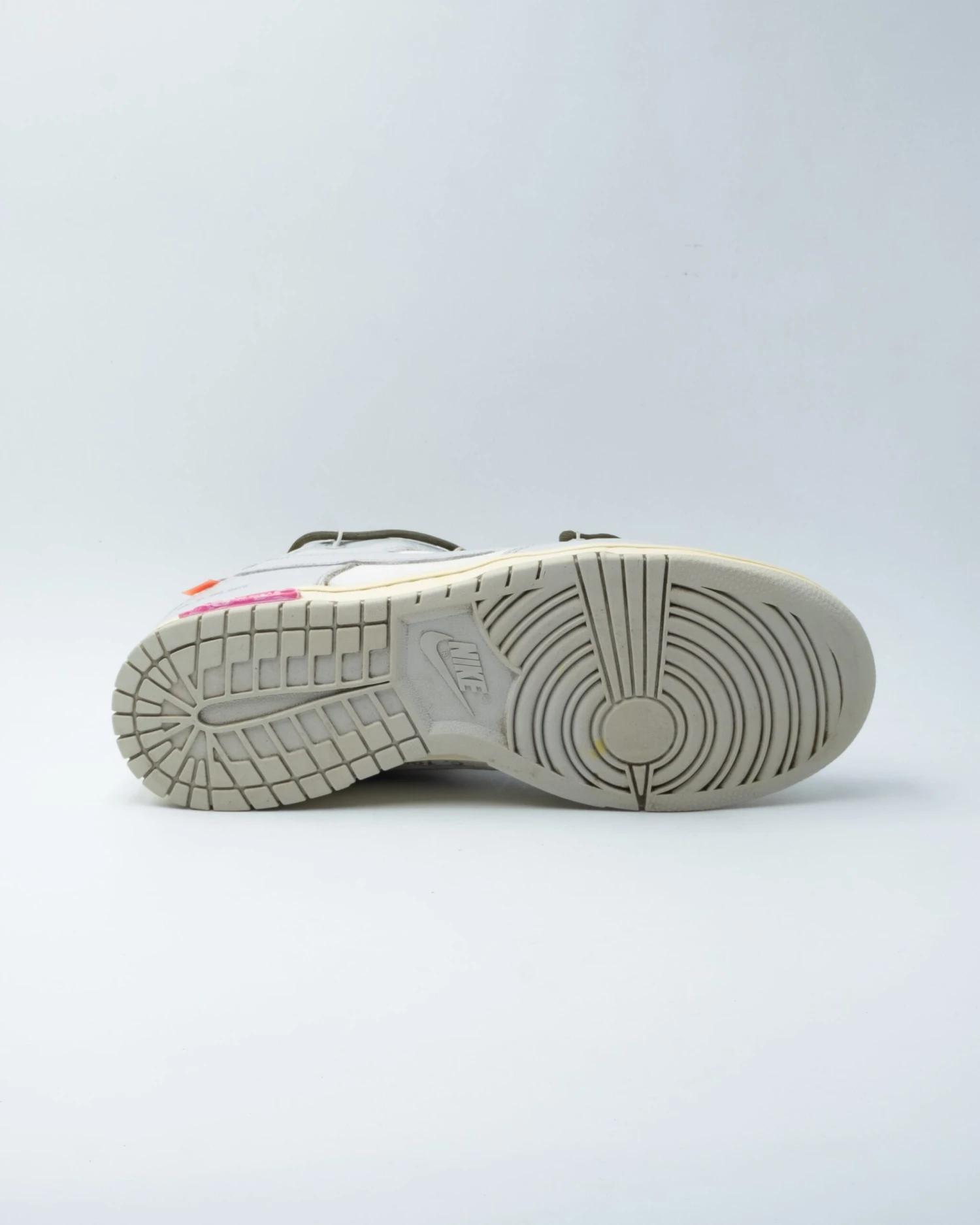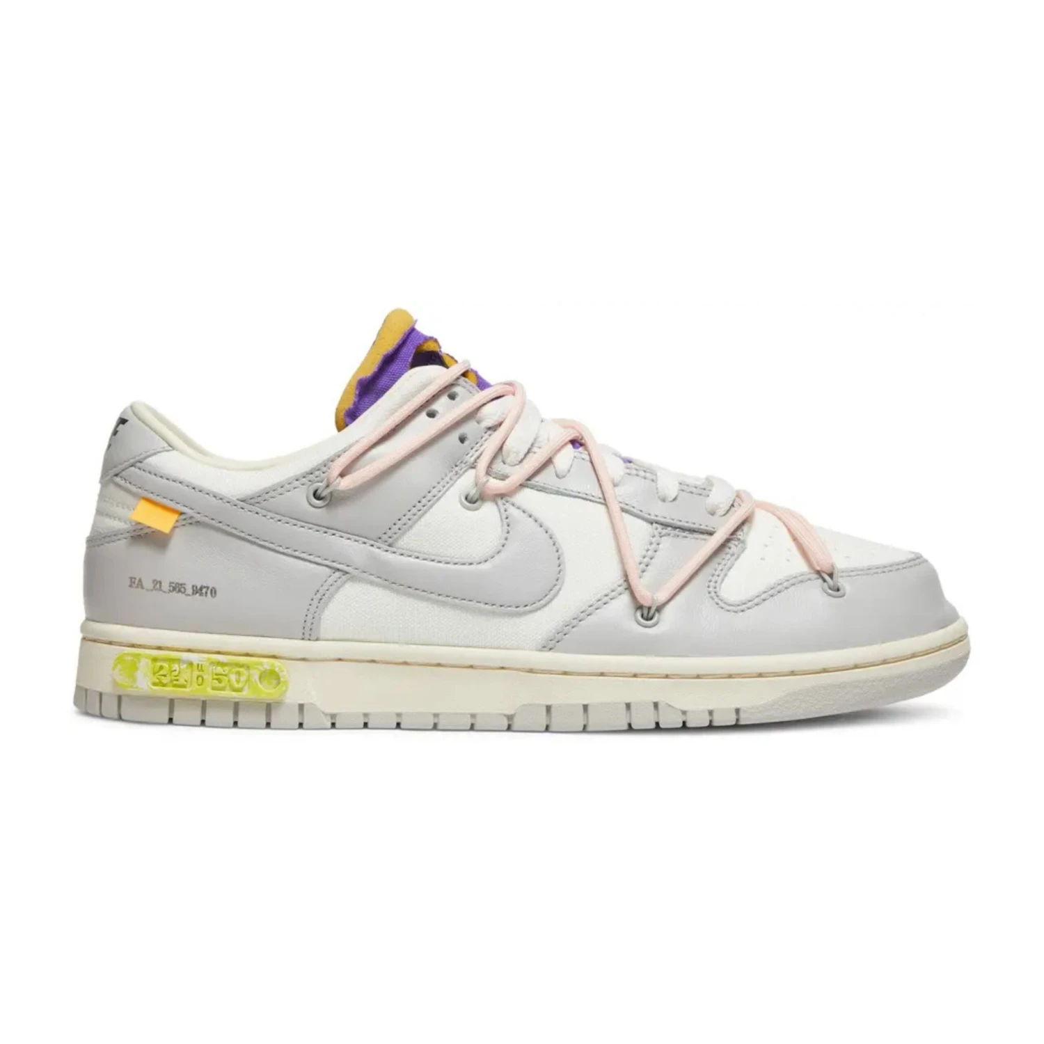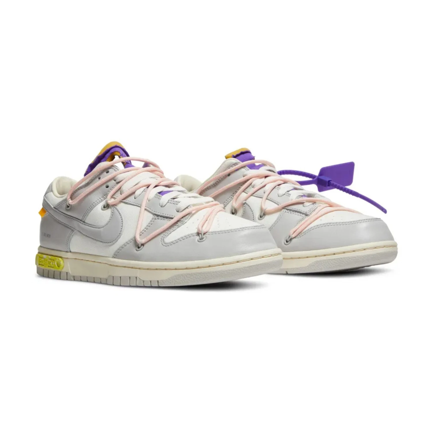 La Nike Dunk Low Off-White Lot 24 se pare d’une base en cuir et canvas, combinant des nuances de gris et de crème. Concernant les éléments de détail, on note du rose pour les surlacets et du violet pour le zip tie et la languette.