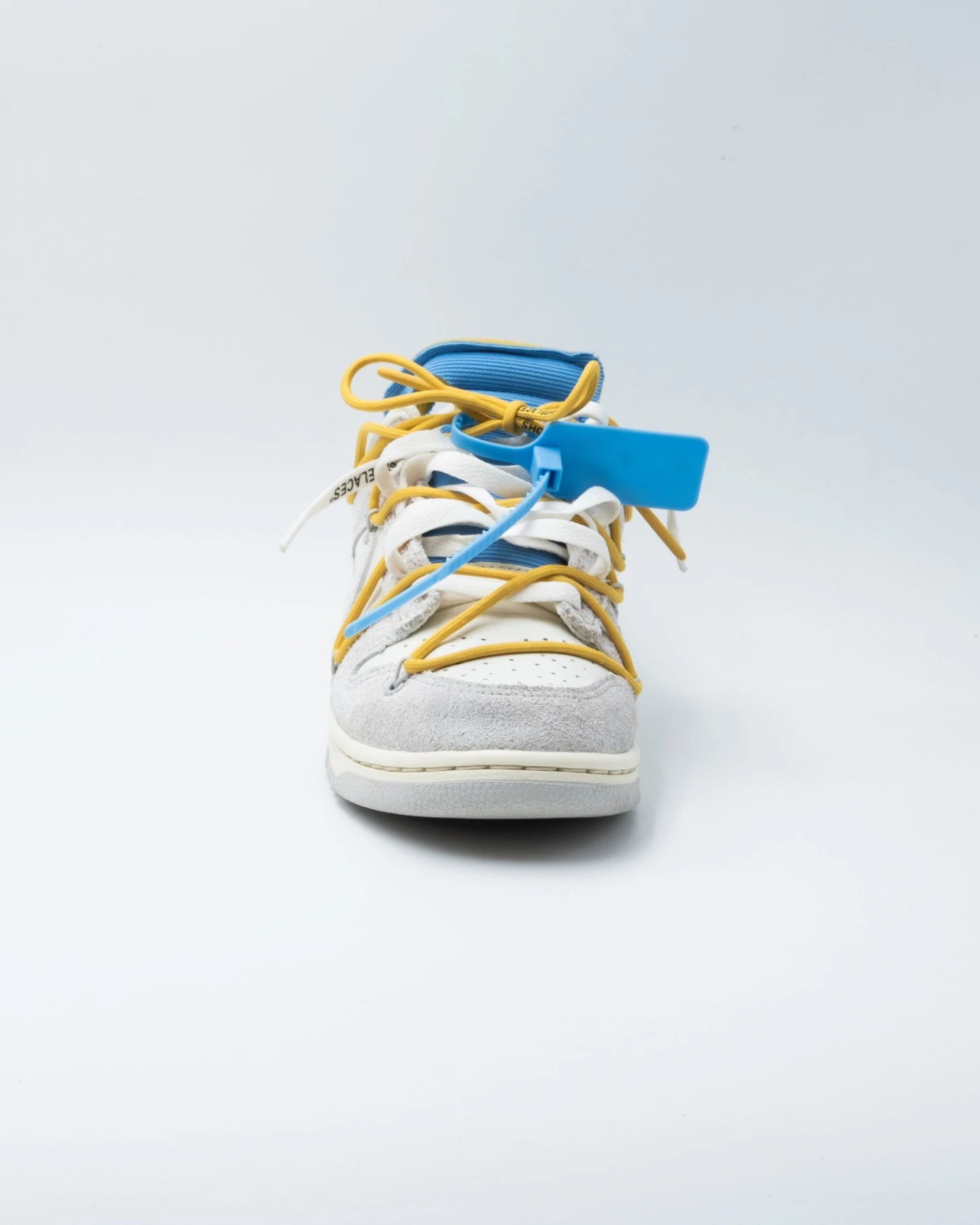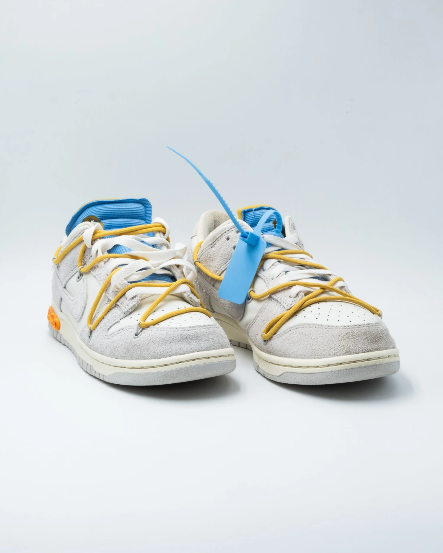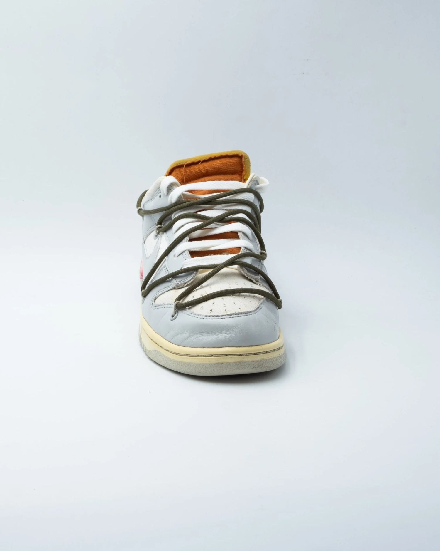 La Nike Dunk Low Off-White Lot 24 se pare d’une base en cuir et canvas, combinant des nuances de gris et de crème. Concernant les éléments de détail, on note du rose pour les surlacets et du violet pour le zip tie et la languette.