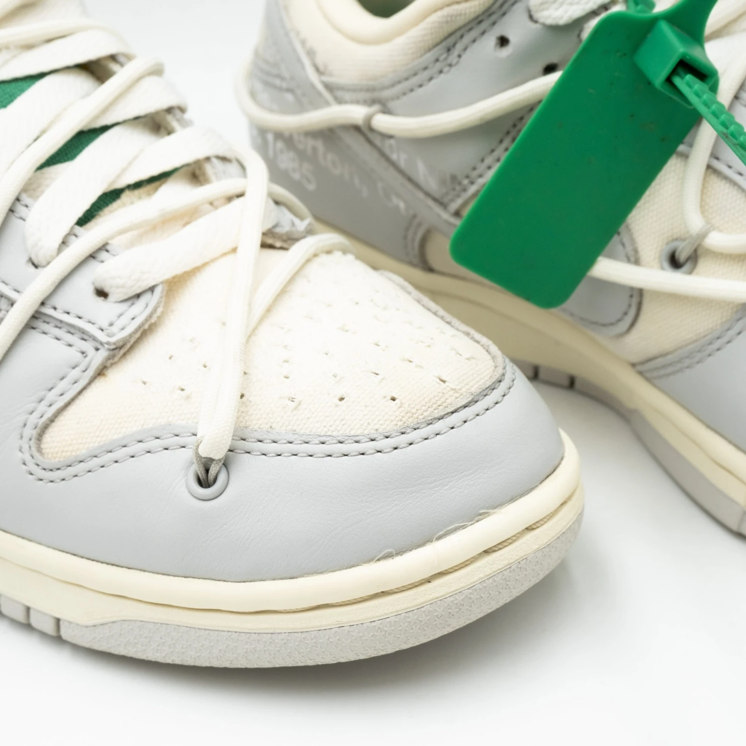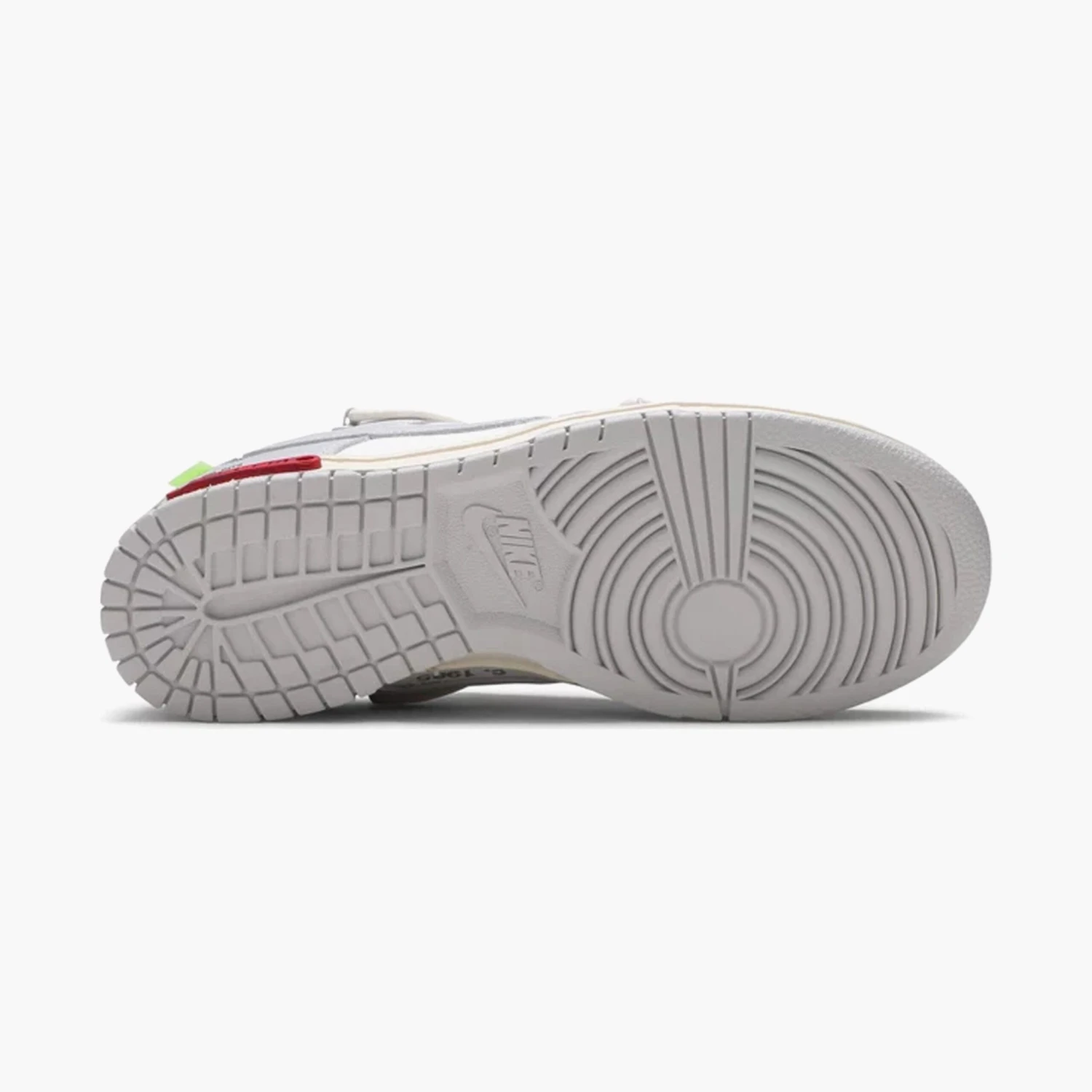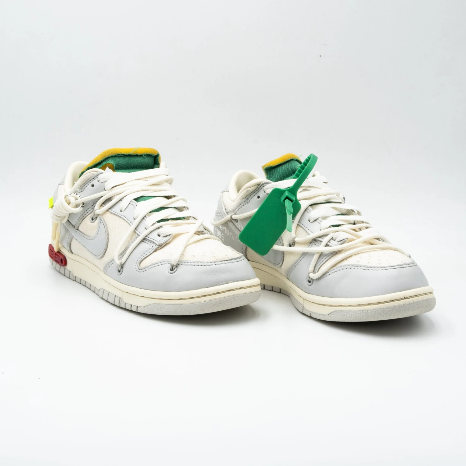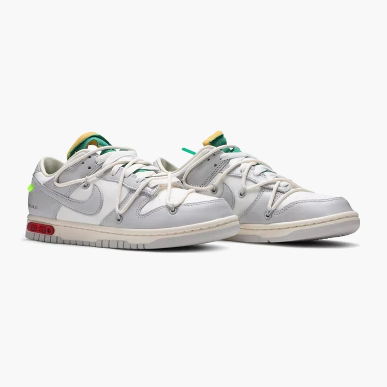 Cette Off-White x Nike Dunk Low est issue de la collection « Dear Summer », une suite tentaculaire à la première collaboration de Virgil Abloh avec la Nike Dunk en 2019. La low-top utilise une tige en cuir blanc avec des superpositions en toile grise douce, ainsi que les ornements de la carte de visite de Virgil Abloh, qui comprennent un lien de fermeture éclair en plastique et un texte Helvetica imprimé. Des touches de couleur contrastantes sont apportées par le système de laçage secondaire, la fermeture éclair, la languette en mousse apparente et la languette rectangulaire apposée sur le Swoosh. Limitée à cinquante paires, un badge « 25 of 50 » est apposé sur la semelle intermédiaire latérale.