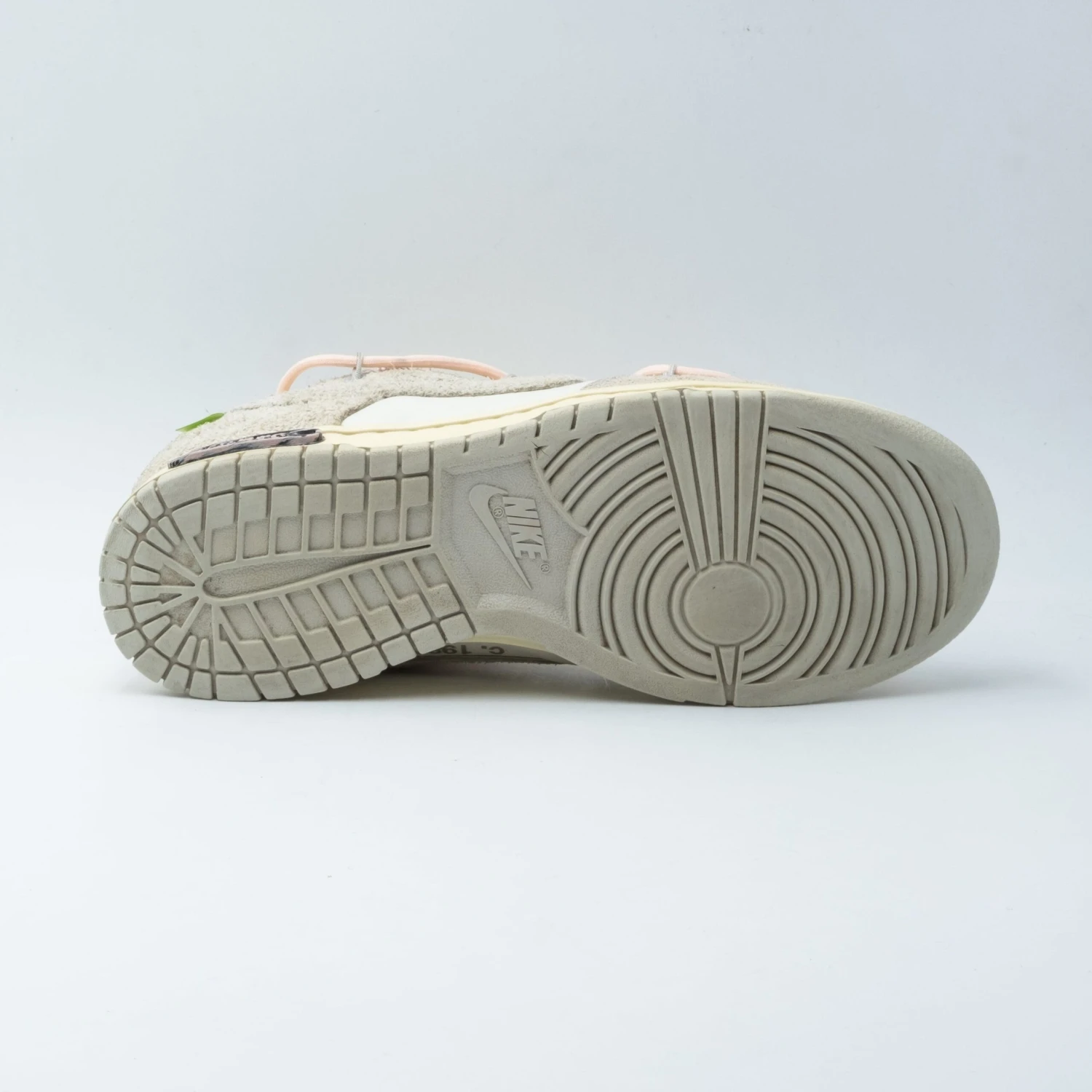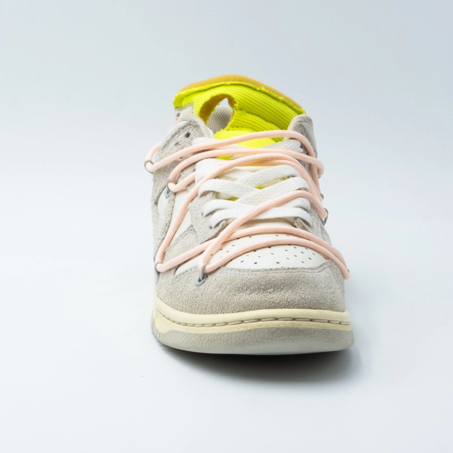 Cette Nike Dunk Low x Off-White est issue de la collection « Dear Summer », une suite tentaculaire à la première collaboration de Virgil Abloh avec la Nike Dunk en 2019. La low-top utilise une tige en cuir blanc avec des superpositions en toile grise douce, ainsi que les ornements de la carte de visite de Virgil Abloh, qui comprennent un lien de fermeture éclair en plastique et un texte Helvetica imprimé. Des touches de couleur contrastantes sont apportées par le système de laçage secondaire, la fermeture éclair, la languette en mousse apparente et la languette rectangulaire apposée sur le Swoosh. Limitée à cinquante paires, un badge « 26 of 50 » est apposé sur la semelle intermédiaire latérale.