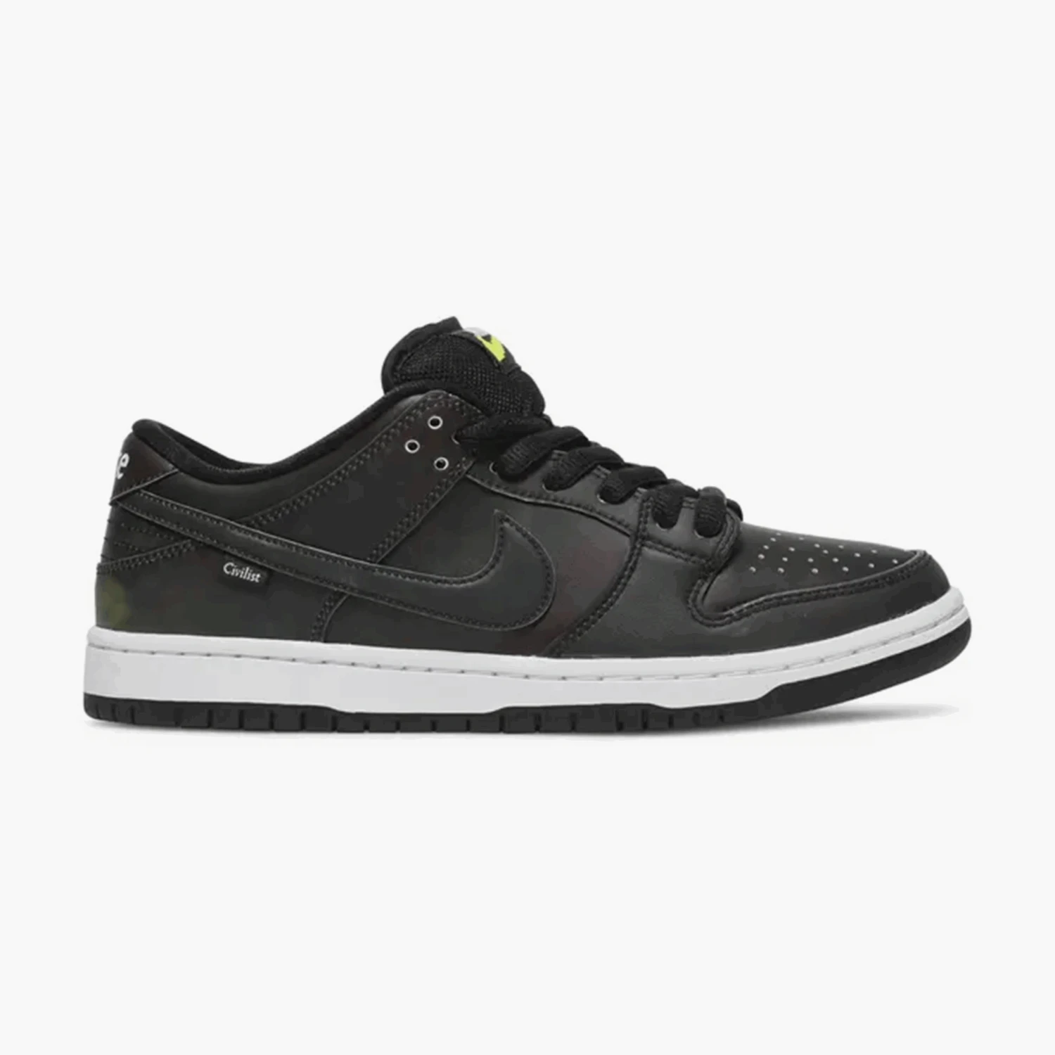 La Nike SB Dunk Low Civilist réserve une énorme surprise. La sneaker présente, à première vue, une tige entièrement noire. Mais lorsque la chaussure est exposée à une source de chaleur élevée, elle se métamorphose en une palette de couleurs éclatantes. Des nuances de bleu, rouge, vert et jaune apparaissent sur le matériau supérieur thermosensible, ajoutant plus de profondeur que prévu.