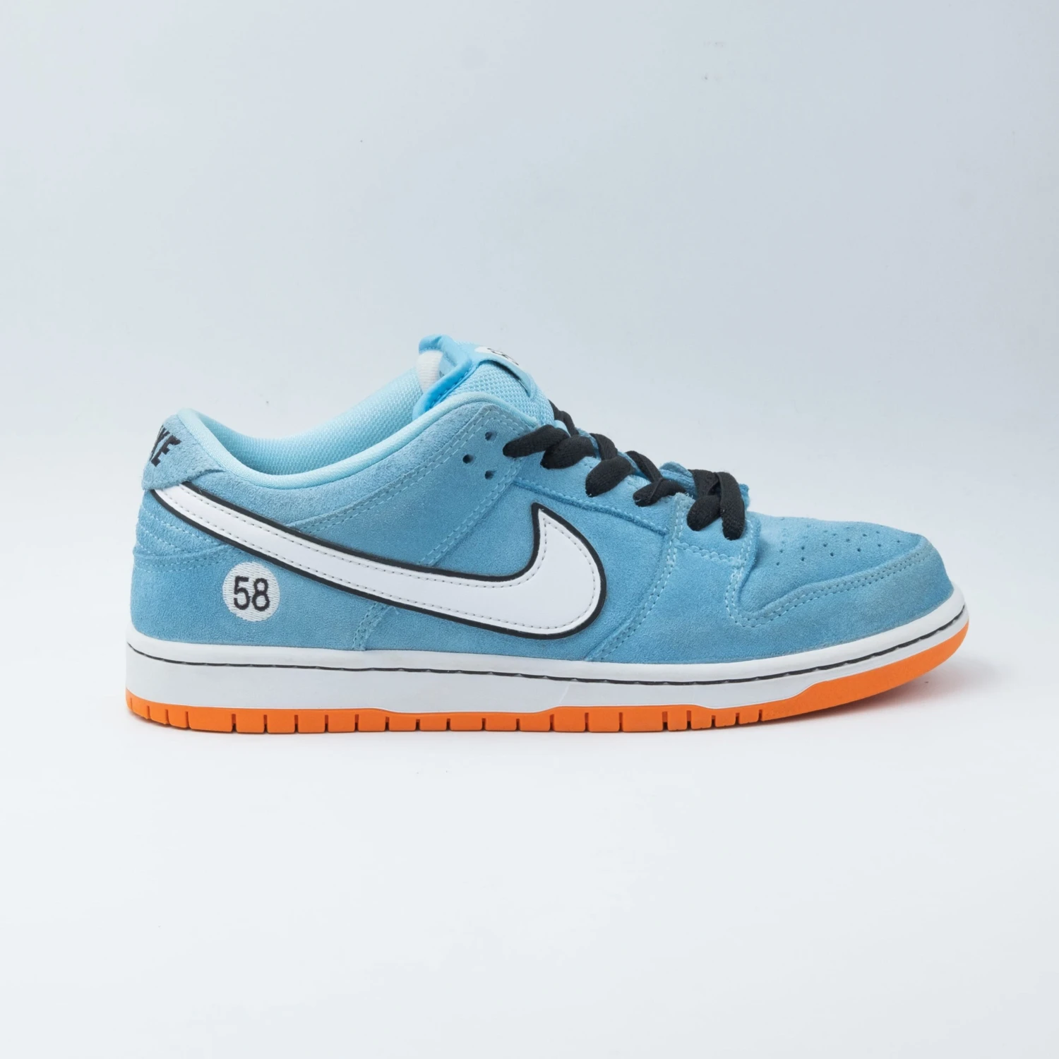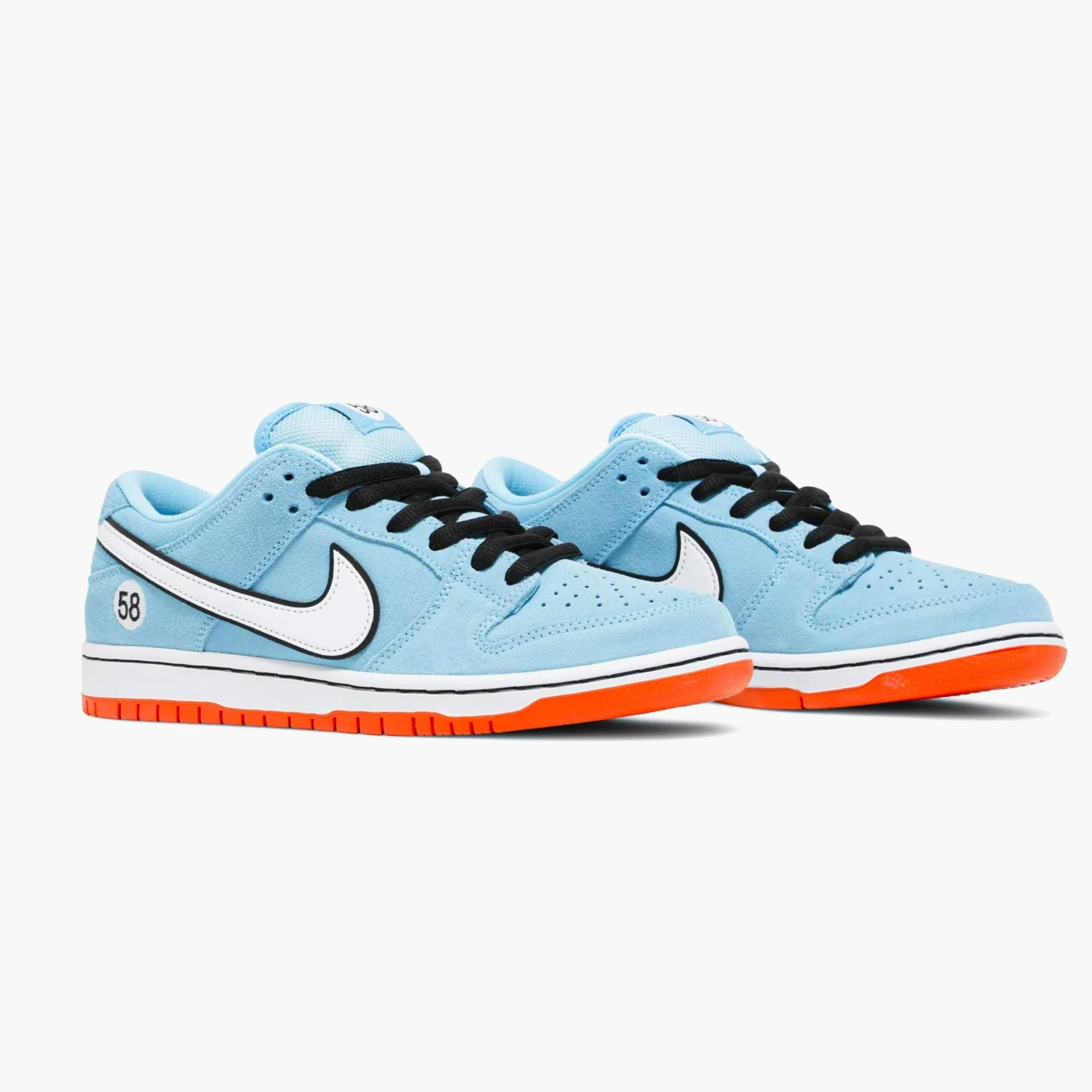 La Nike SB Dunk Low Club 58 Gulf présente une empeigne en daim de couleur turquoise. Les lacets noirs et le Swoosh en cuir blanc viennent contraster la silhouette. Un patch avec le numéro 58 est brodé proche du talon. Le design se finalise sur une semelle bicolore : blanche avec une outsole orange.