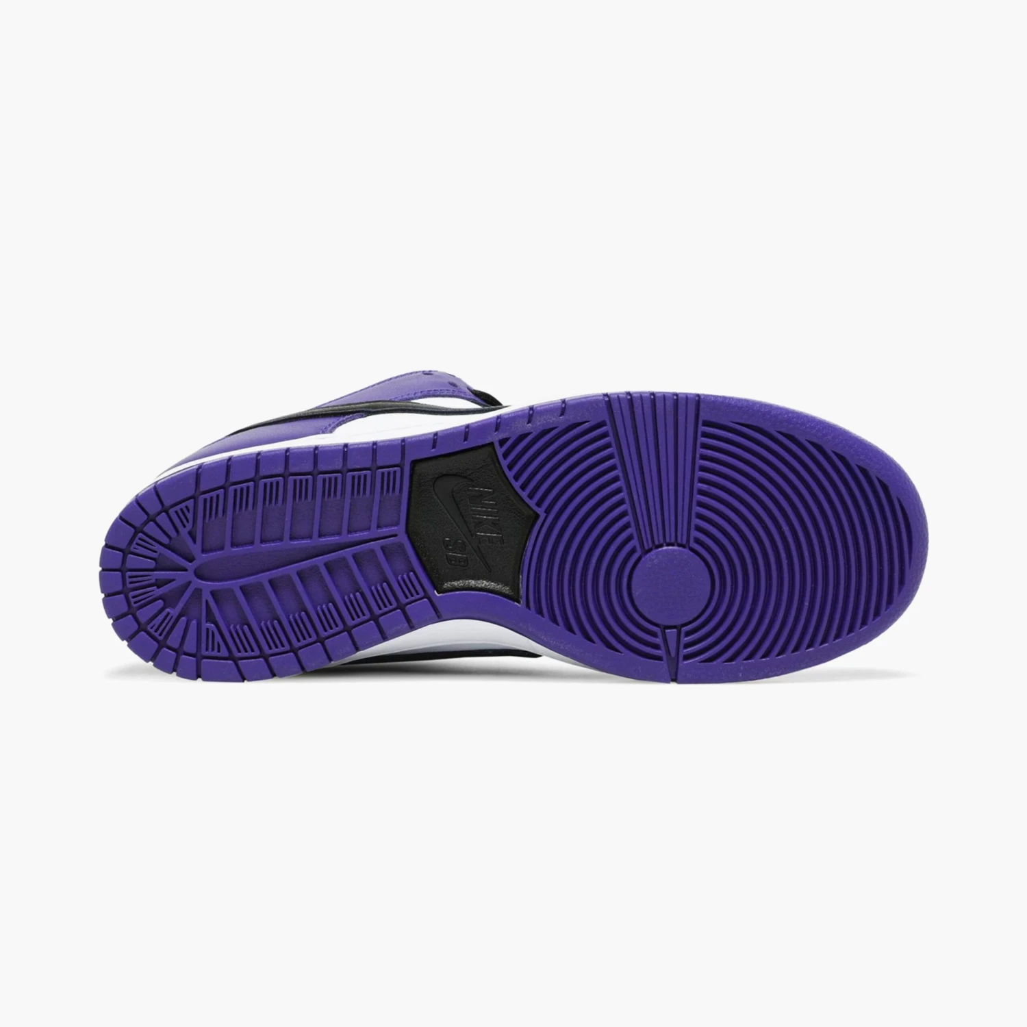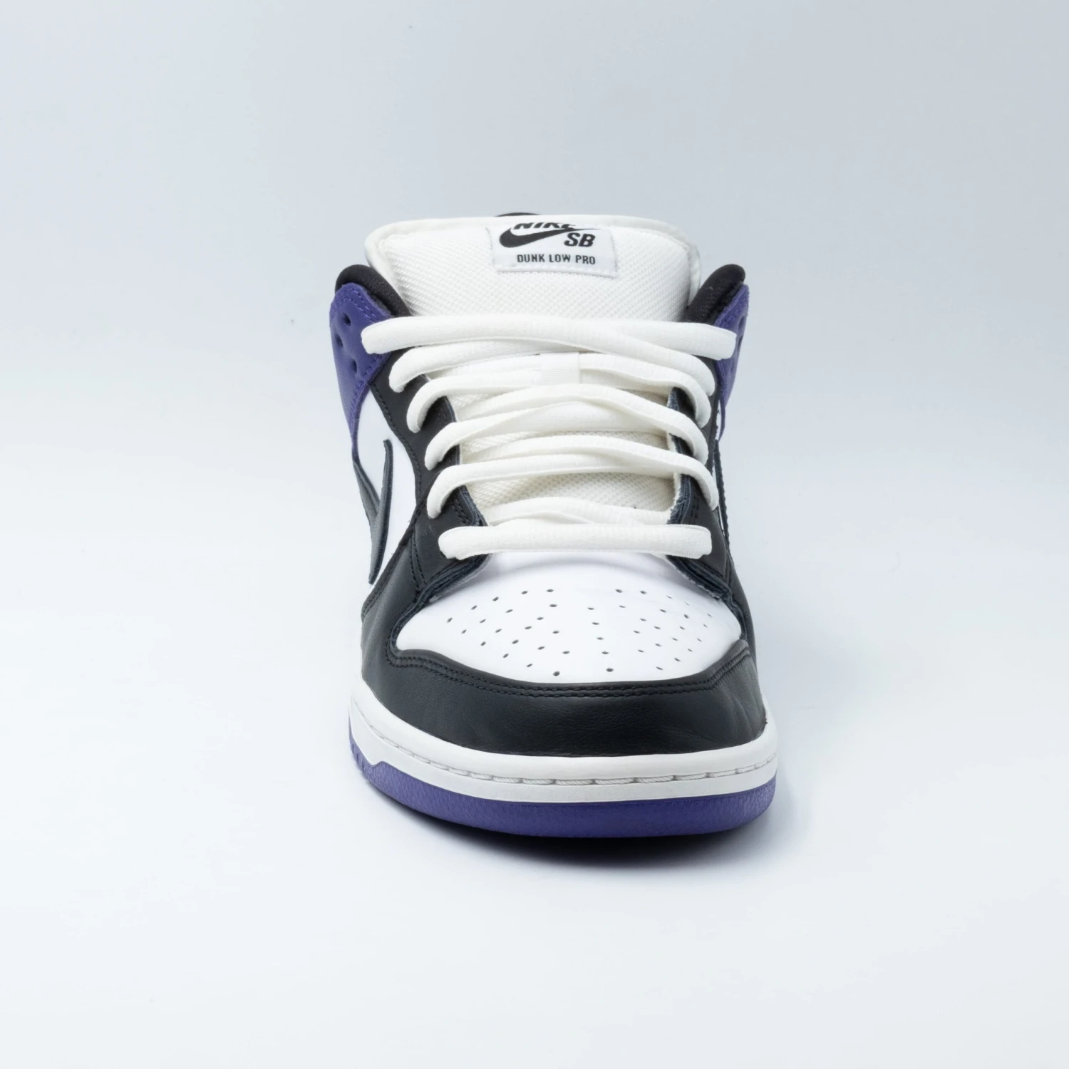 Cette Nike SB Dunk Low Court Purple présente une tige en cuir blanc avec des empiècements noirs contrastants sur l’avant-pied, les œillets et le col. Le Court Purple apparaît sur le renfort du talon, assorti à la semelle extérieure en caoutchouc.
