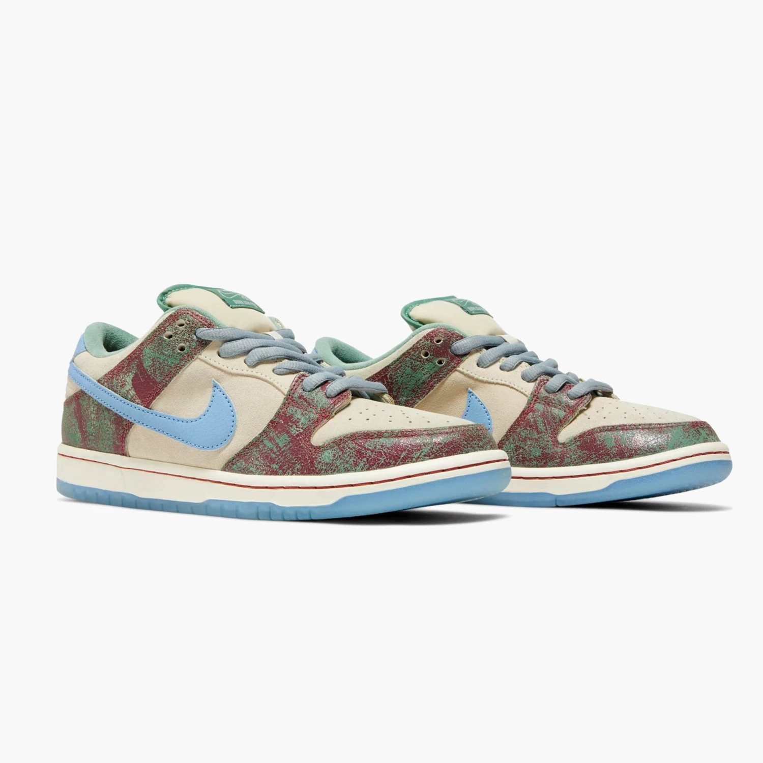 La Crenshaw Skate Club x Nike Dunk Low SB propose une version colorée de la Dunk SB. Conçue en collaboration avec Tobias McIntosh, fondateur du CSC, la chaussure présente une base en daim beige avec des superpositions en cuir craquelé inspirées du panneau de Crenshaw Square, un repère local dans le quartier de Los Angeles de McIntosh. Les logos Nike et CSC en dépareillé apparaissent sur chaque étiquette de languette.
