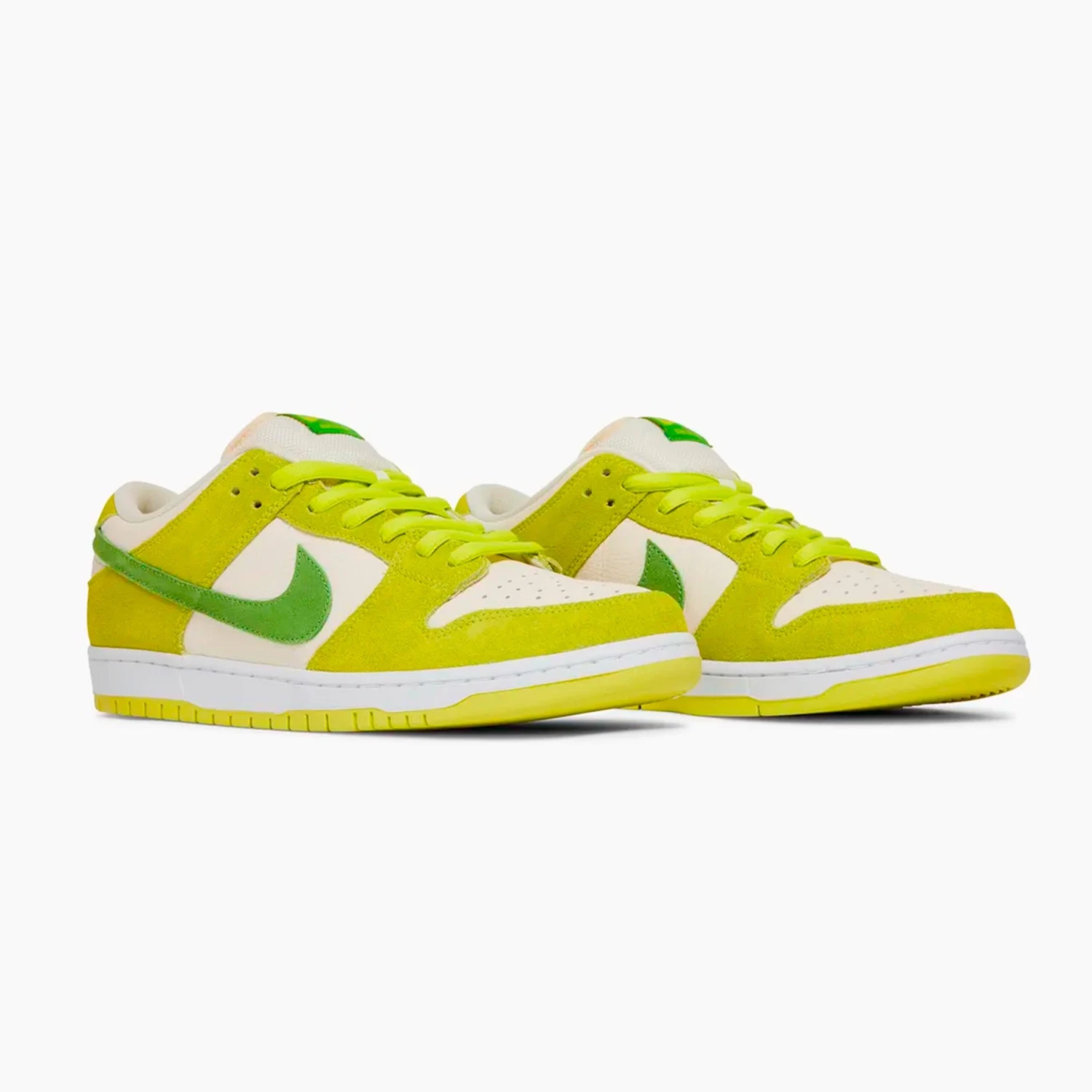 Sortie dans le cadre du « Fruity Pack », la Nike Dunk Low Pro SB ‘Green Apple’ présente des teintes vives qui rappellent un verger verdoyant. La low-top est dotée d’une empeigne qui combine une base en cuir en Coconut Milk et des superpositions en daim en Atomic Green. Le Swoosh et l’étiquette de la languette de la Nike SB sont d’un vert plus foncé, avec un graphisme ludique de pomme verte à l’intérieur. À l’intérieur de la chaussure, le chausson en mousse est complété par une unité Zoom Air au niveau du talon.