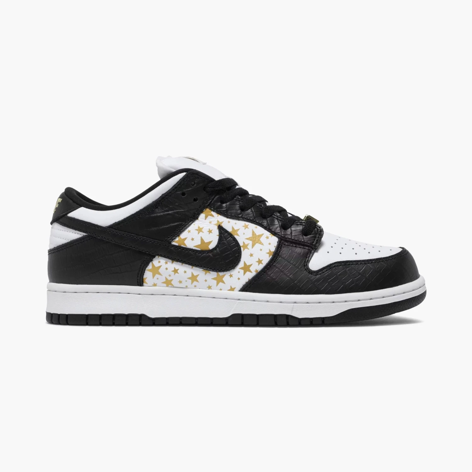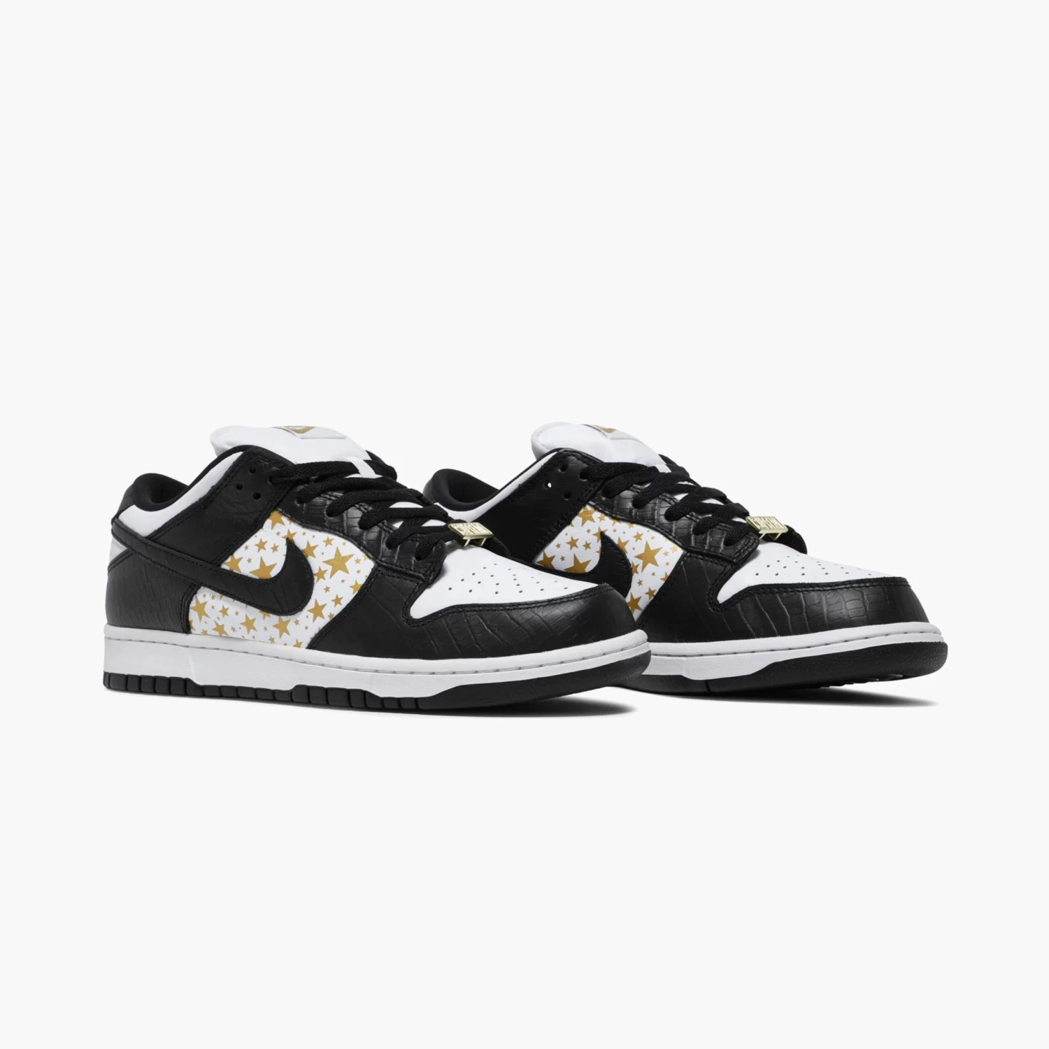 La Supreme x Nike Dunk Low OG SB QS ‘Black’ rend hommage à la sortie du Dunk High des deux marques partenaires en 2003. Cette chaussure reprend pratiquement toutes les caractéristiques clés de l’ancienne, avec une base en cuir blanc, des étoiles dorées imprimées et des empiècements contrastés en cuir croco noir.