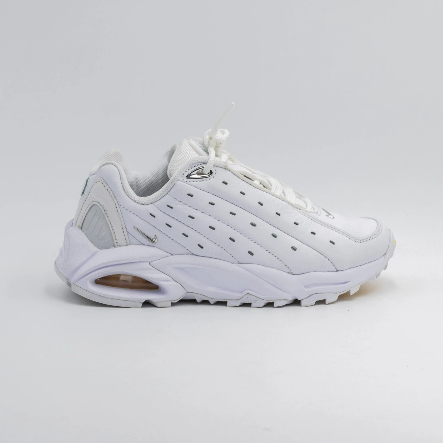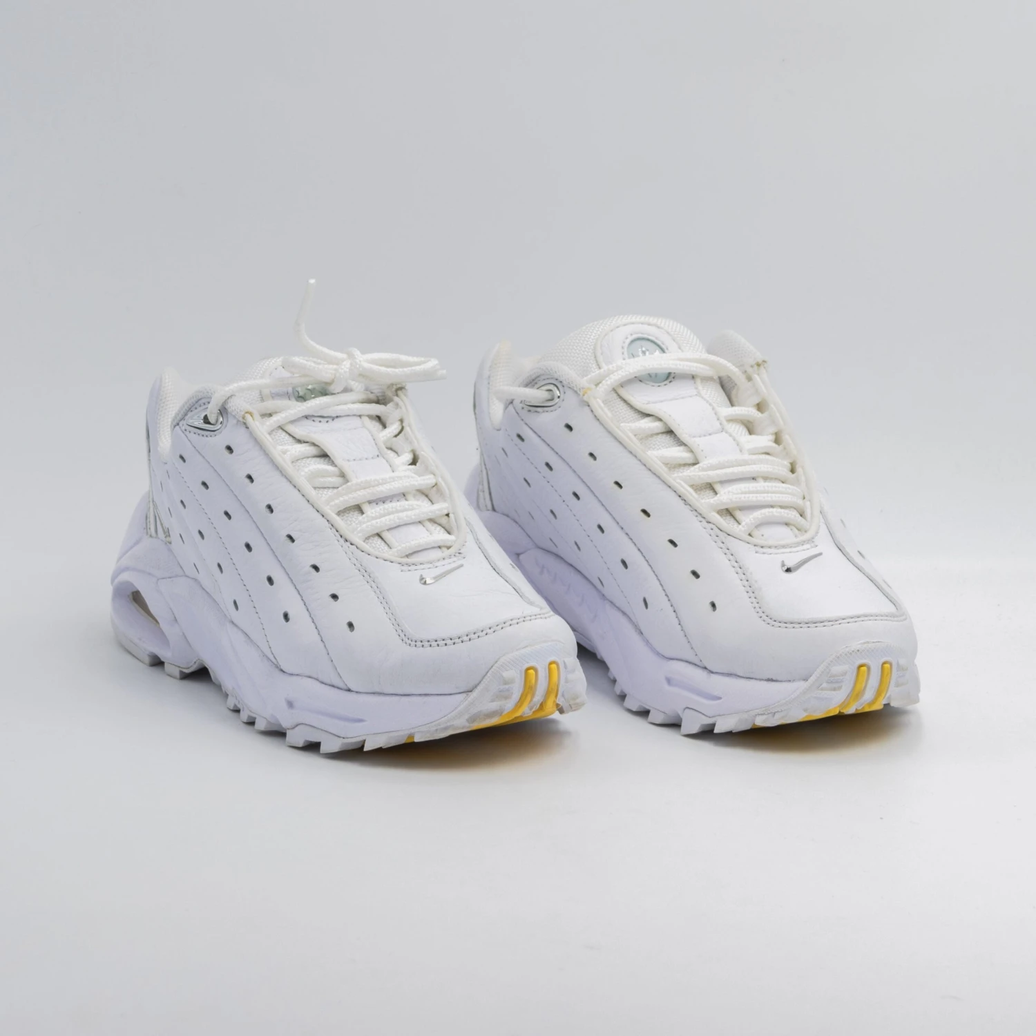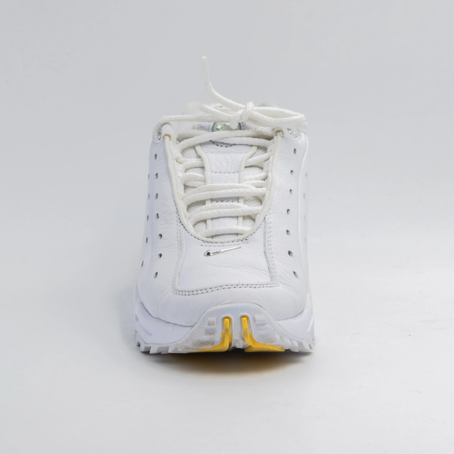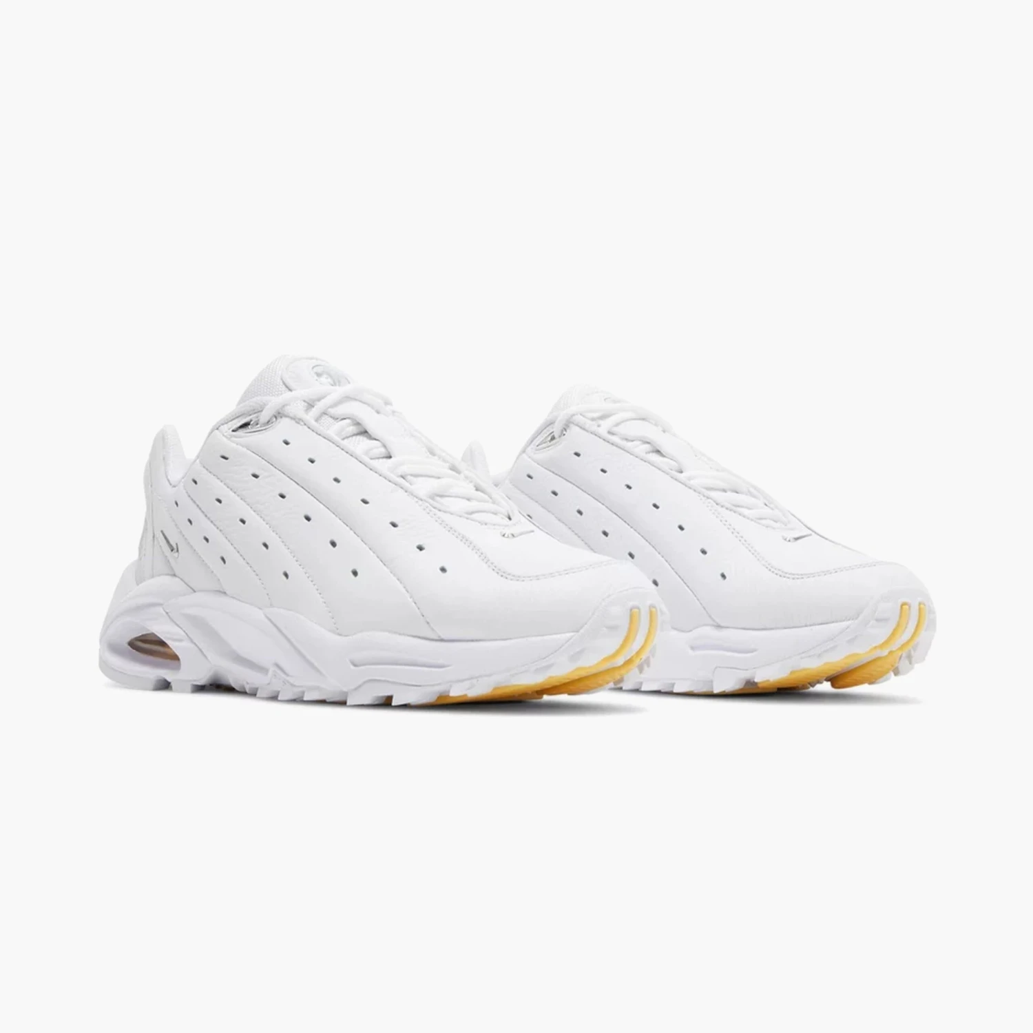 La Nike Hot Step Air Terra ‘White’, issue de la collaboration NOCTA, utilise une tige en cuir retourné dans une finition ardoise blanche. Une série de lignes de surpiqûres en diagonale, ainsi que des détails perforés, embellissent chacun des panneaux latéraux de la sneaker. La marque NOCTA, ornée de bijoux, est apposée sur la languette, tandis que des mini-Swooshes chromées ornent la zone des orteils et le talon latéral. La sneaker repose sur une semelle intermédiaire en mousse blanche assortie, dotée de parois latérales sculptées et d’une unité Air-sole teintée en jaune sous le talon.