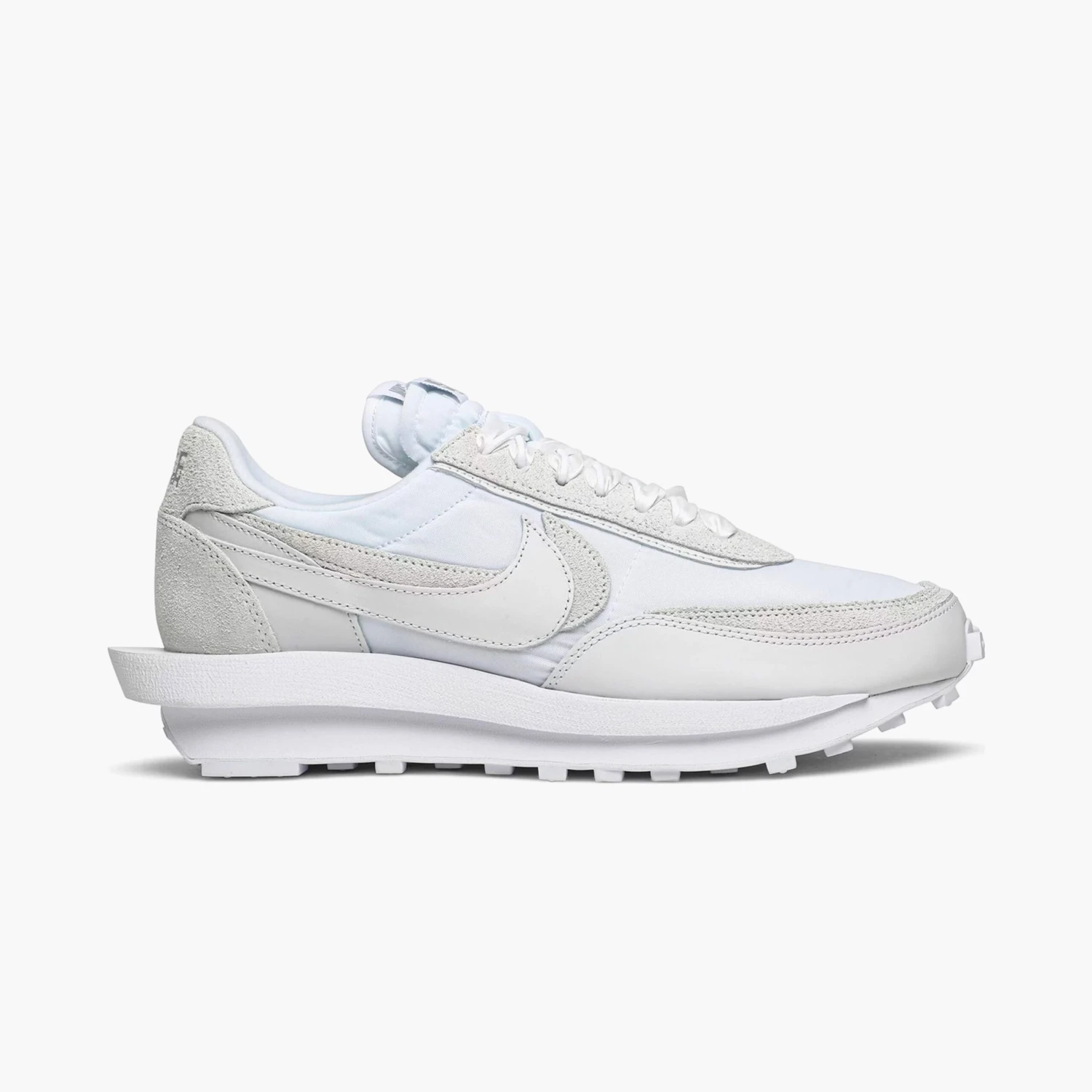 La LD Waffle Sacai White affiche les mêmes caractéristiques que la Triple Black, à l’exception que tous les éléments sont transposés en blanc. On retrouve le double swoosh, doubles lacets, double languette et une semelle propre aux LD Waffle Sacai. En termes de texture, c’est un mélange de texture poussé, avec du mesh, du nylon ainsi que du cuir.