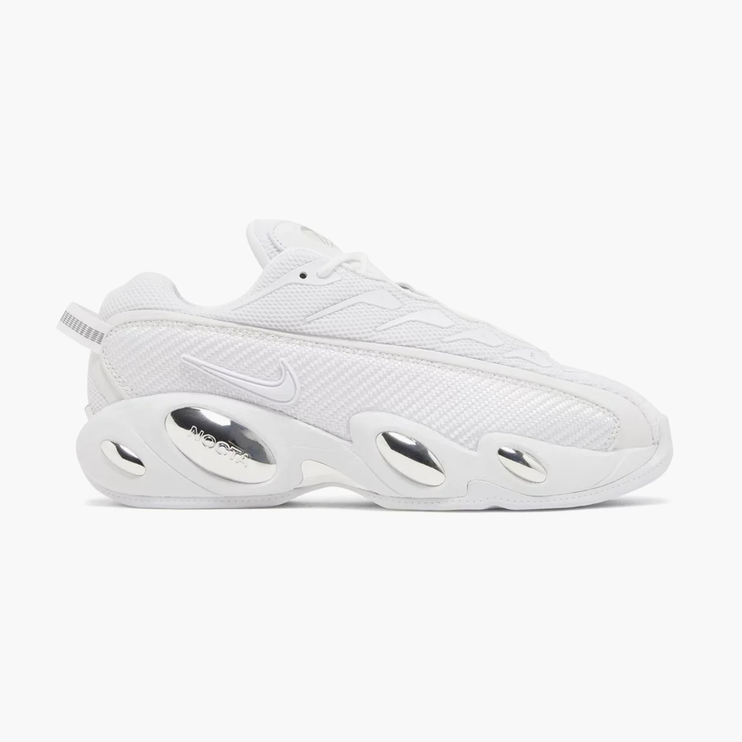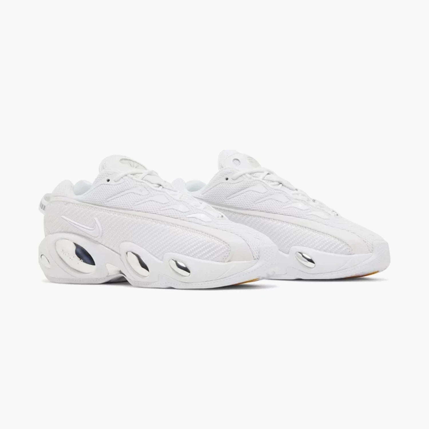 La NOCTA x Nike Glide ‘Triple White’ est un coloris épuré de la silhouette lifestyle basée sur la chaussure de basket Zoom Flight 95. L’empeigne combine une maille blanche respirante et un textile tissé sur l’empiècement du milieu du pied. Cette dernière est agrémentée d’un mini-Swoosh moulé, tandis que le logo NOCTA orne la languette. La chaussure repose sur une semelle intermédiaire volumineuse en Phylon, avec un amorti Zoom Air à l’avant-pied et des détails uniques en forme d’œil d’insecte incrustés dans la paroi latérale.