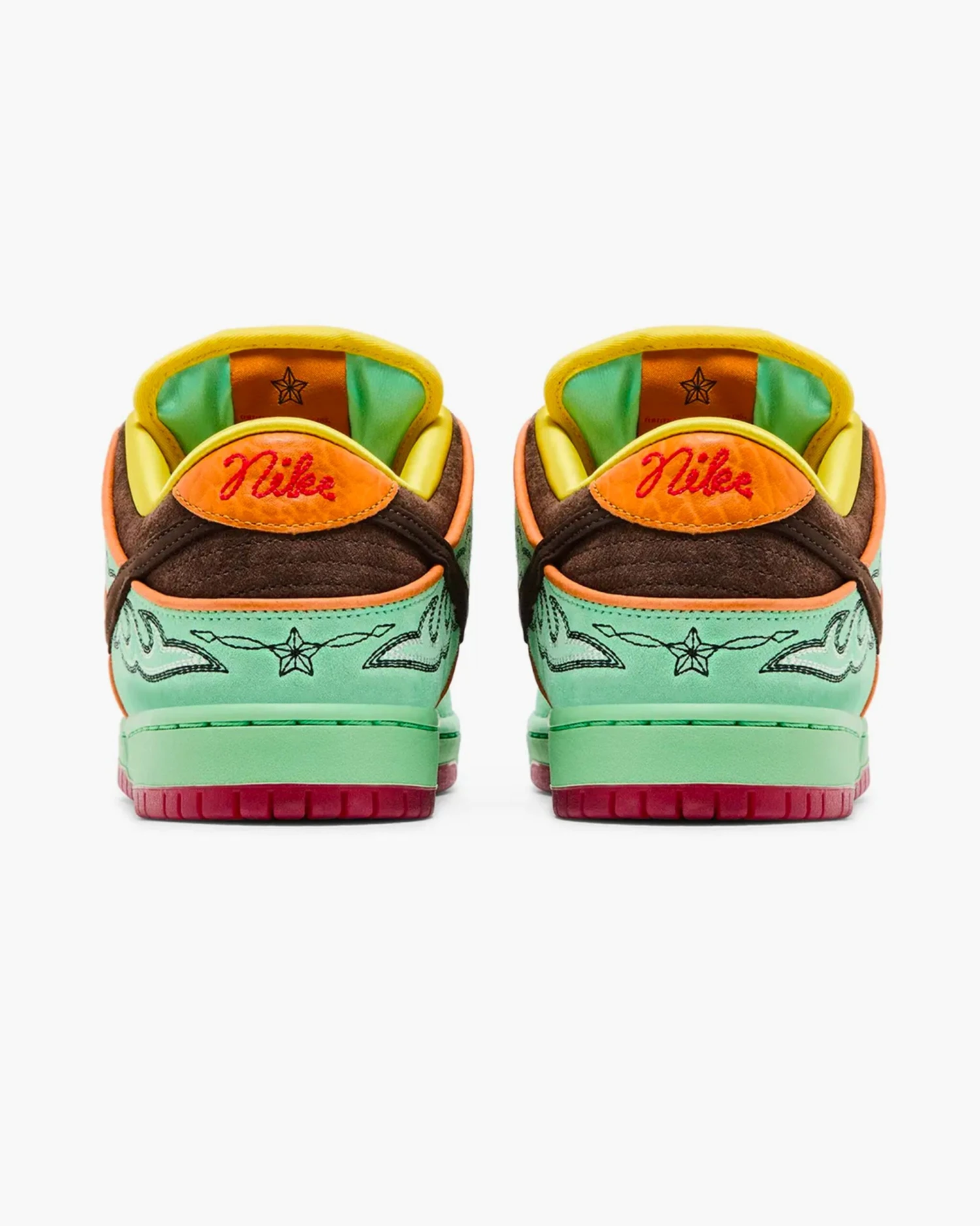 La Dunk Low SB ‘Rodeo‘, également connue sous le nom de ‘Tourmaline’, présente une tige en daim vert vif fixée par des lacets en corde tressée. Un Swoosh en daim noir orne le panneau latéral, tandis qu’une broderie unique de style Sonora décore la partie supérieure du talon. Des touches de couleur contrastantes sont apportées par un liseré orange, une doublure en textile jaune et une languette arrière en cuir orange marquée du logo Nike cramoisi. À l’intérieur de la chaussure, la semelle intérieure est ornée d’une illustration personnalisée représentant un cow-boy gardant du bétail.