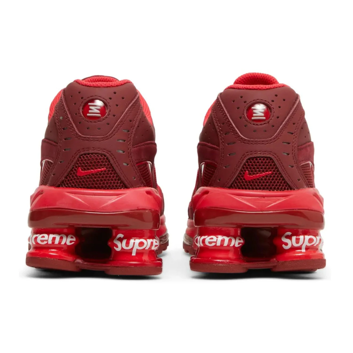 La Nike Shox Ride 2 Supreme Red dévoile une base en mesh rouge aux différents empiècements en cuir, nubuck et TPU. Sa structure technique se voit complétée par différents éléments réfléchissants. Une unité Air Max vient soutenir l’avant du pied et complète l’arrière à l’amorti Shox. Ces derniers arborent un branding Supreme blanc qui finalise le look aérodynamique.