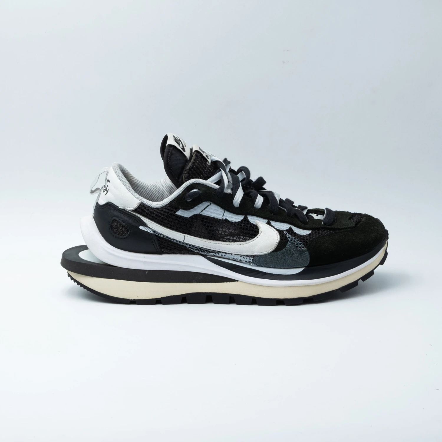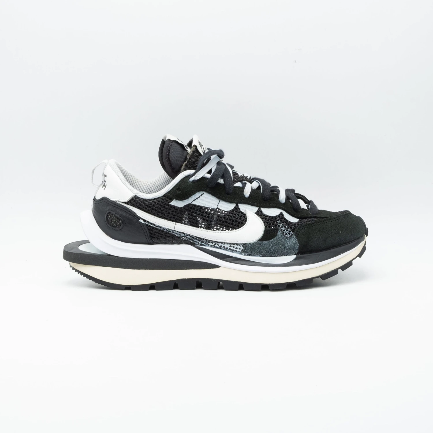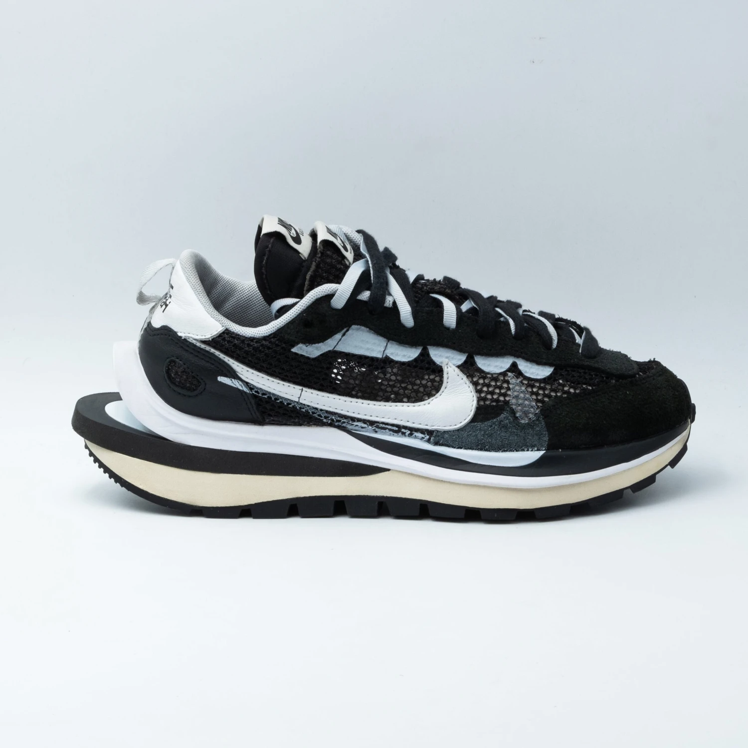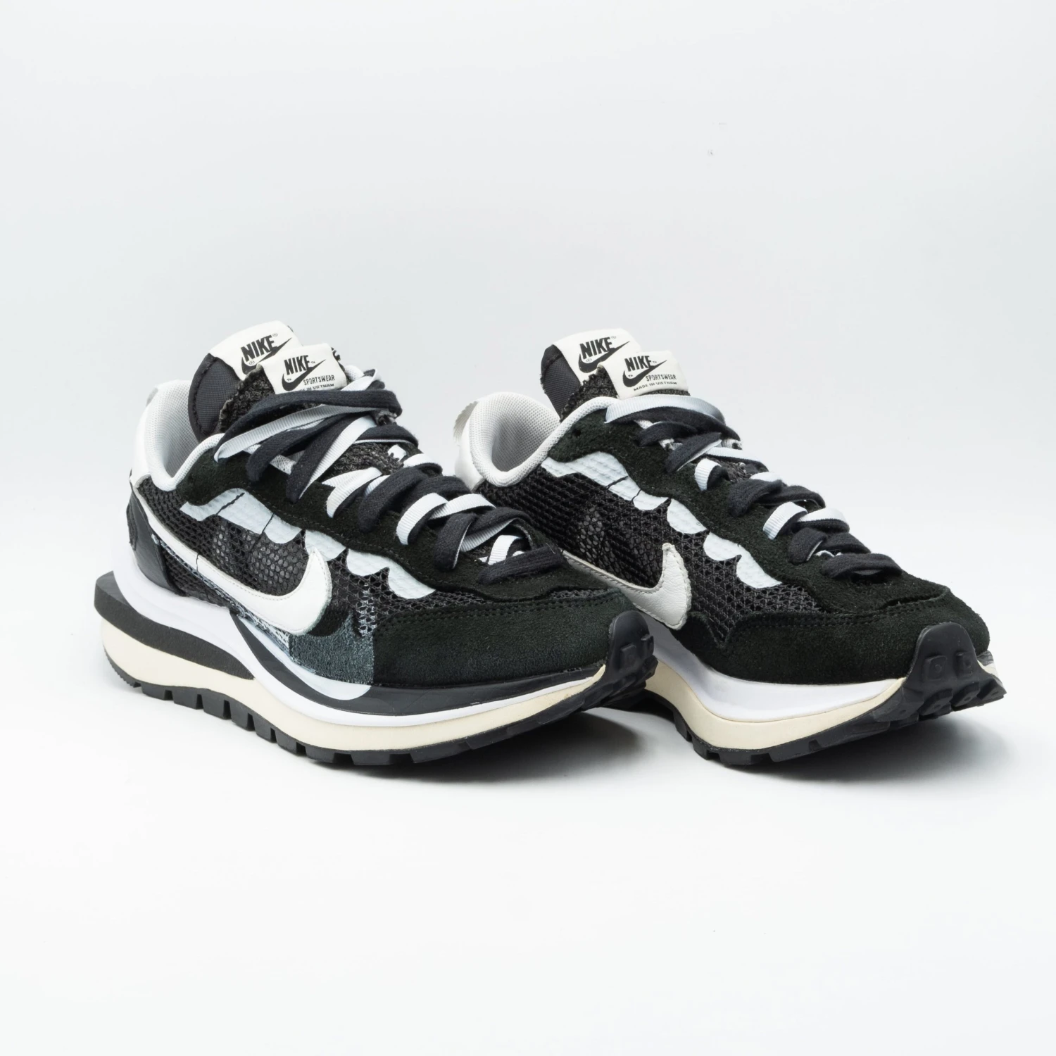 Nike et la marque japonaise Sacai ont collaboré pour créer une nouvelle silhouette hybride qui combine les éléments de la Nike VaporFly et de la Nike Pegasus. La Nike Sacai Vaporwaffle Black White est constituée d’une empeigne qui mélange des matériaux tels que le mesh, le suède et le cuir. Un swoosh blanc sur le côté ajoute un contraste saisissant à ce modèle principalement sombre. Comme caractéristique distinctive de Sacai, cette chaussure présente une construction déstructurée qui fusionne les caractéristiques des deux modèles : deux semelles, deux swoosh, deux languettes, entre autres. Le branding Sacai est présent sur le talon et les languettes, soulignant la collaboration entre les deux marques.