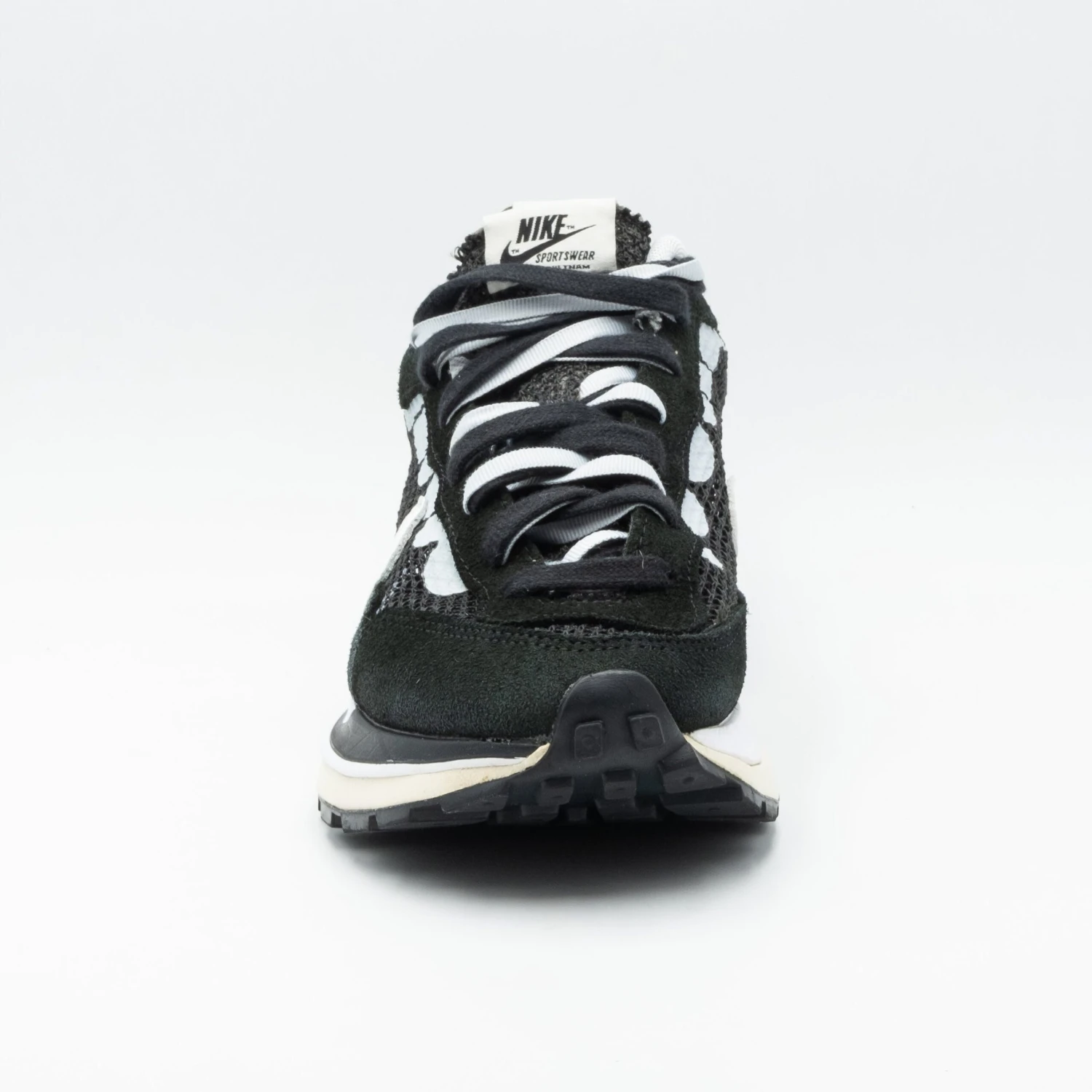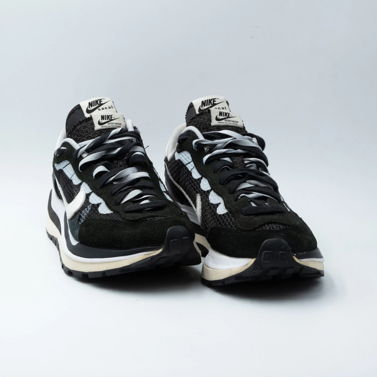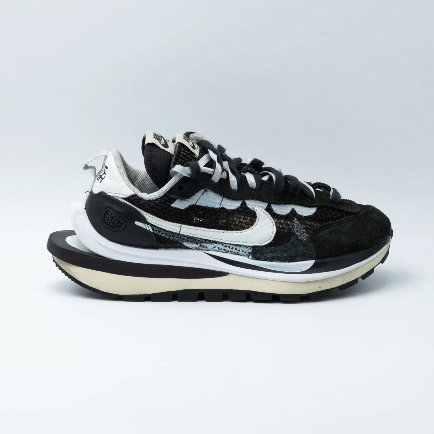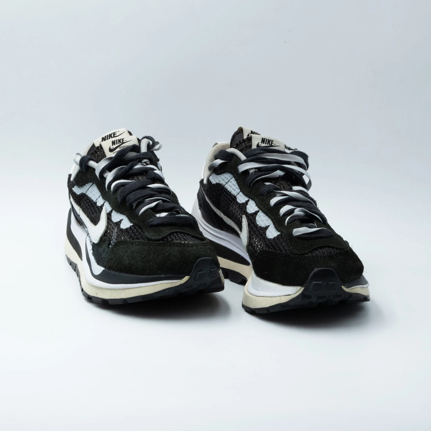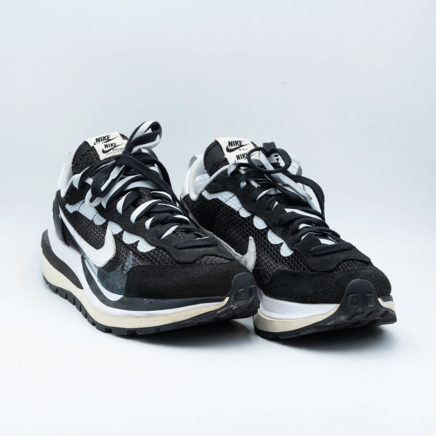 Nike et la marque japonaise Sacai ont collaboré pour créer une nouvelle silhouette hybride qui combine les éléments de la Nike VaporFly et de la Nike Pegasus. La Nike Sacai Vaporwaffle Black White est constituée d’une empeigne qui mélange des matériaux tels que le mesh, le suède et le cuir. Un swoosh blanc sur le côté ajoute un contraste saisissant à ce modèle principalement sombre. Comme caractéristique distinctive de Sacai, cette chaussure présente une construction déstructurée qui fusionne les caractéristiques des deux modèles : deux semelles, deux swoosh, deux languettes, entre autres. Le branding Sacai est présent sur le talon et les languettes, soulignant la collaboration entre les deux marques.
