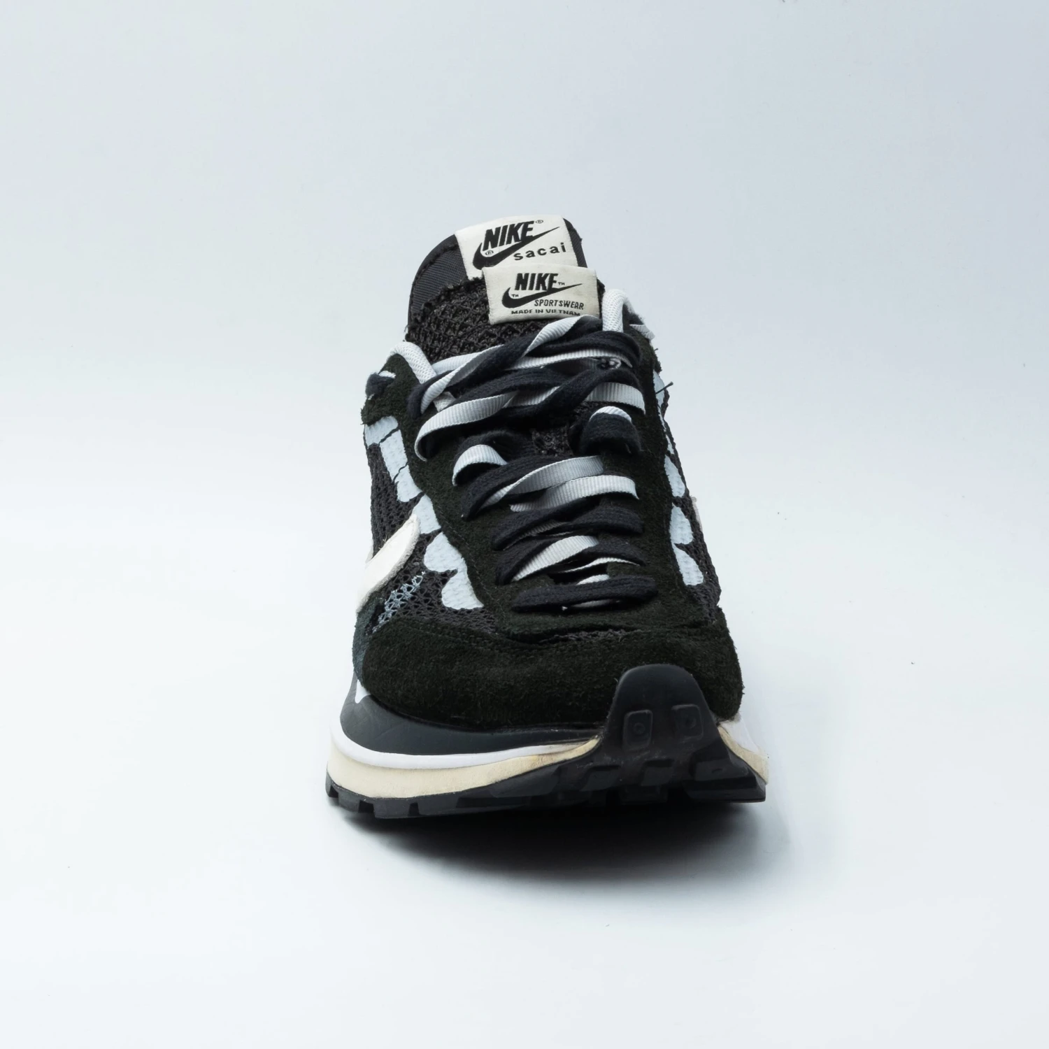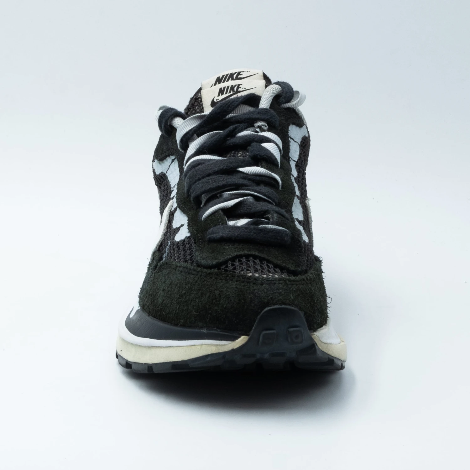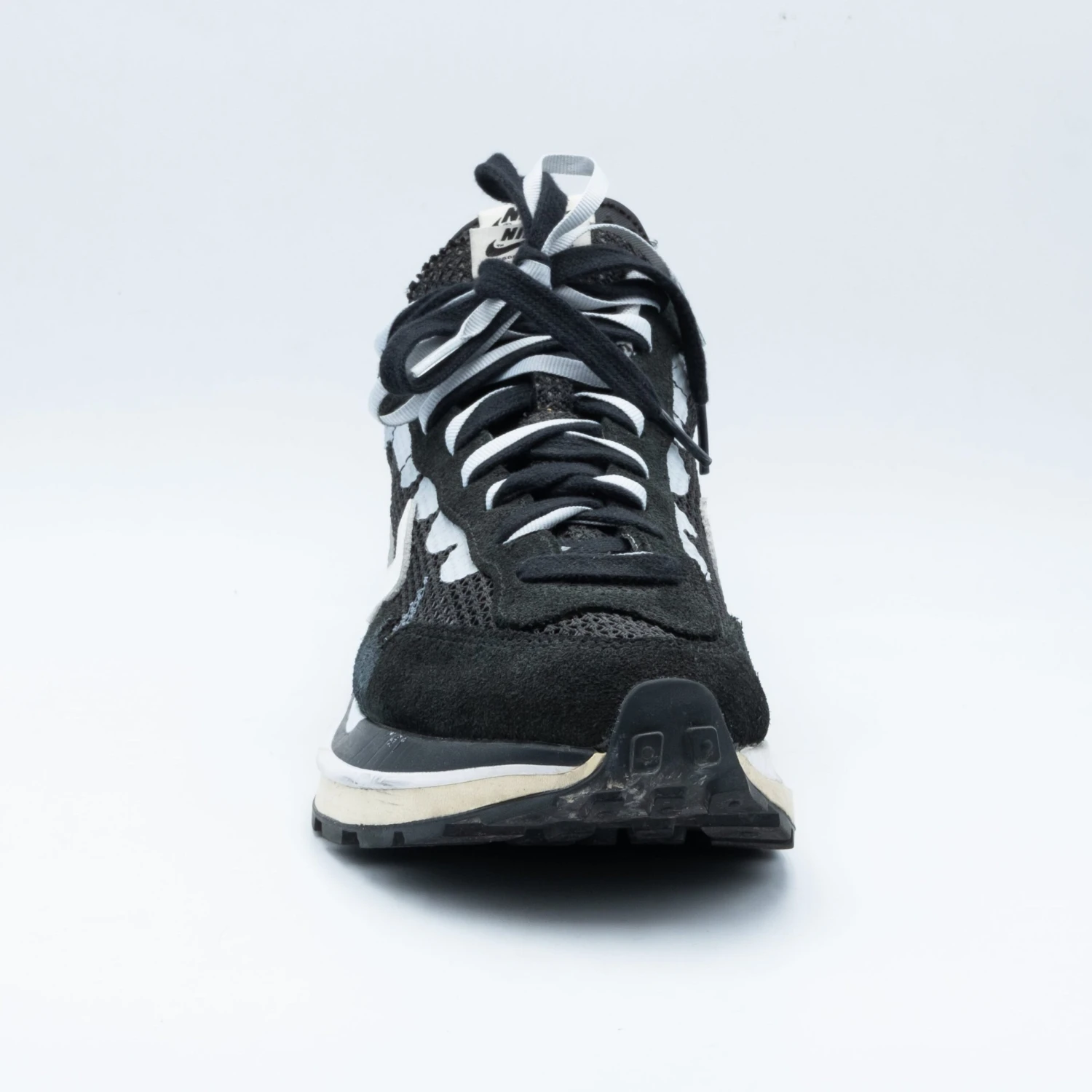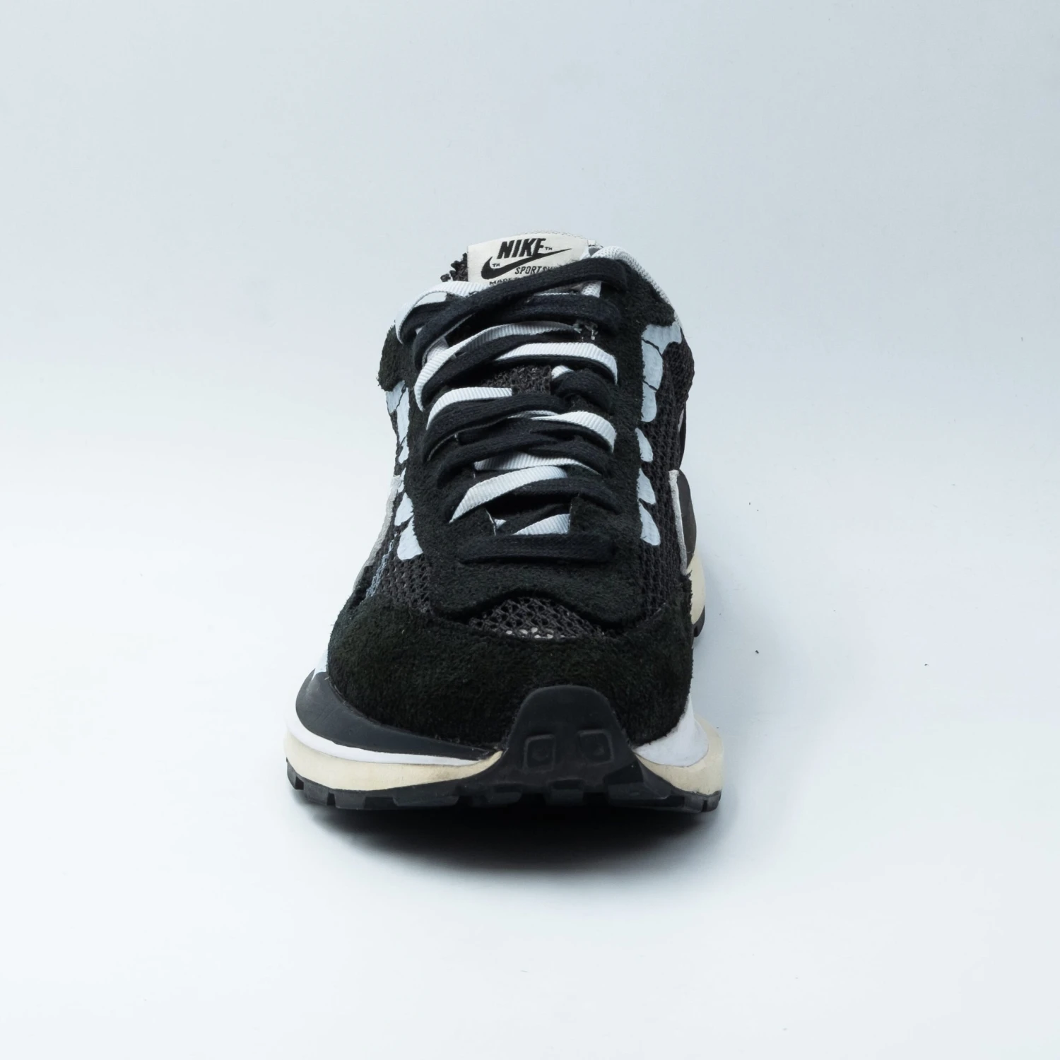 Nike et la marque japonaise Sacai ont collaboré pour créer une nouvelle silhouette hybride qui combine les éléments de la Nike VaporFly et de la Nike Pegasus. La Nike Sacai Vaporwaffle Black White est constituée d’une empeigne qui mélange des matériaux tels que le mesh, le suède et le cuir. Un swoosh blanc sur le côté ajoute un contraste saisissant à ce modèle principalement sombre. Comme caractéristique distinctive de Sacai, cette chaussure présente une construction déstructurée qui fusionne les caractéristiques des deux modèles : deux semelles, deux swoosh, deux languettes, entre autres. Le branding Sacai est présent sur le talon et les languettes, soulignant la collaboration entre les deux marques.