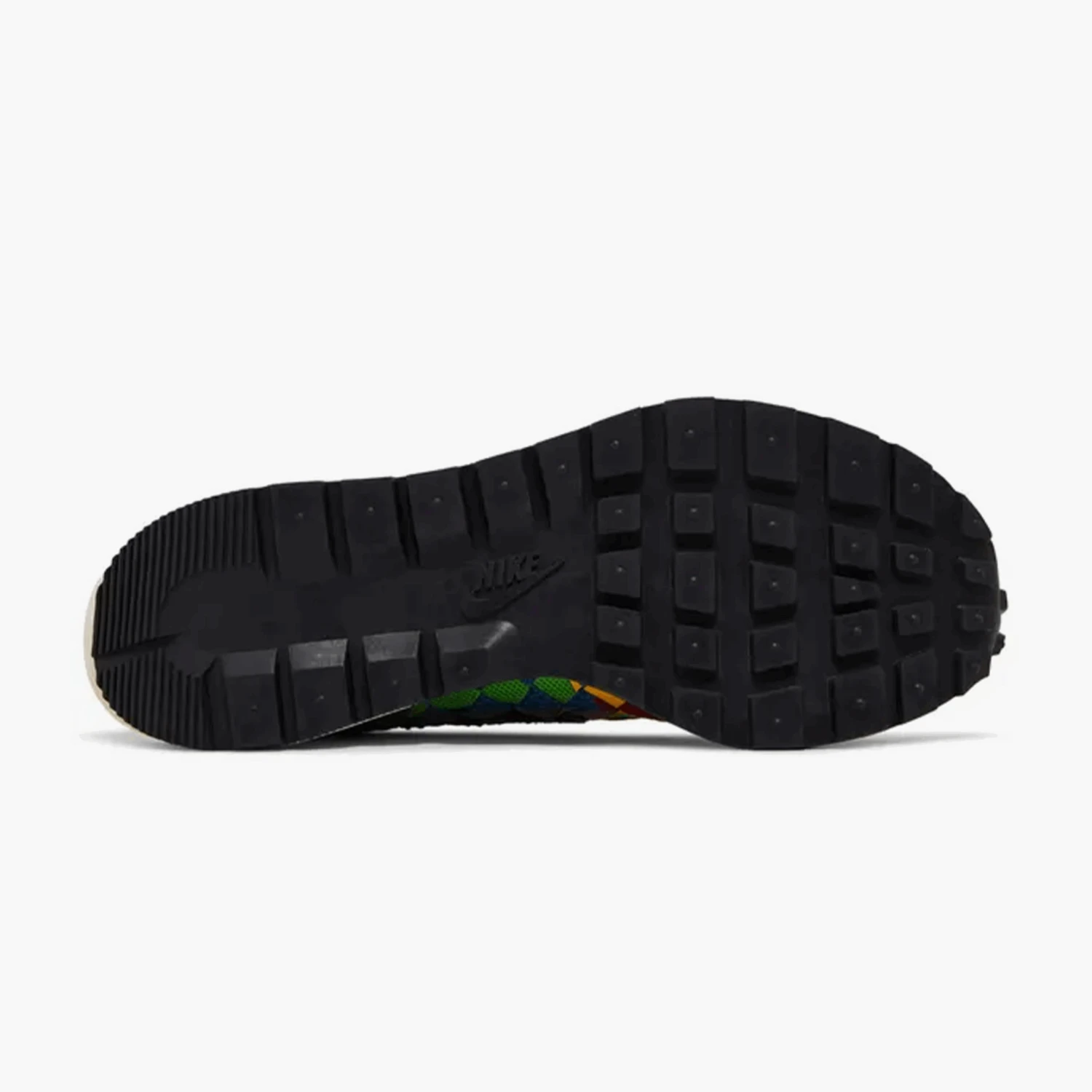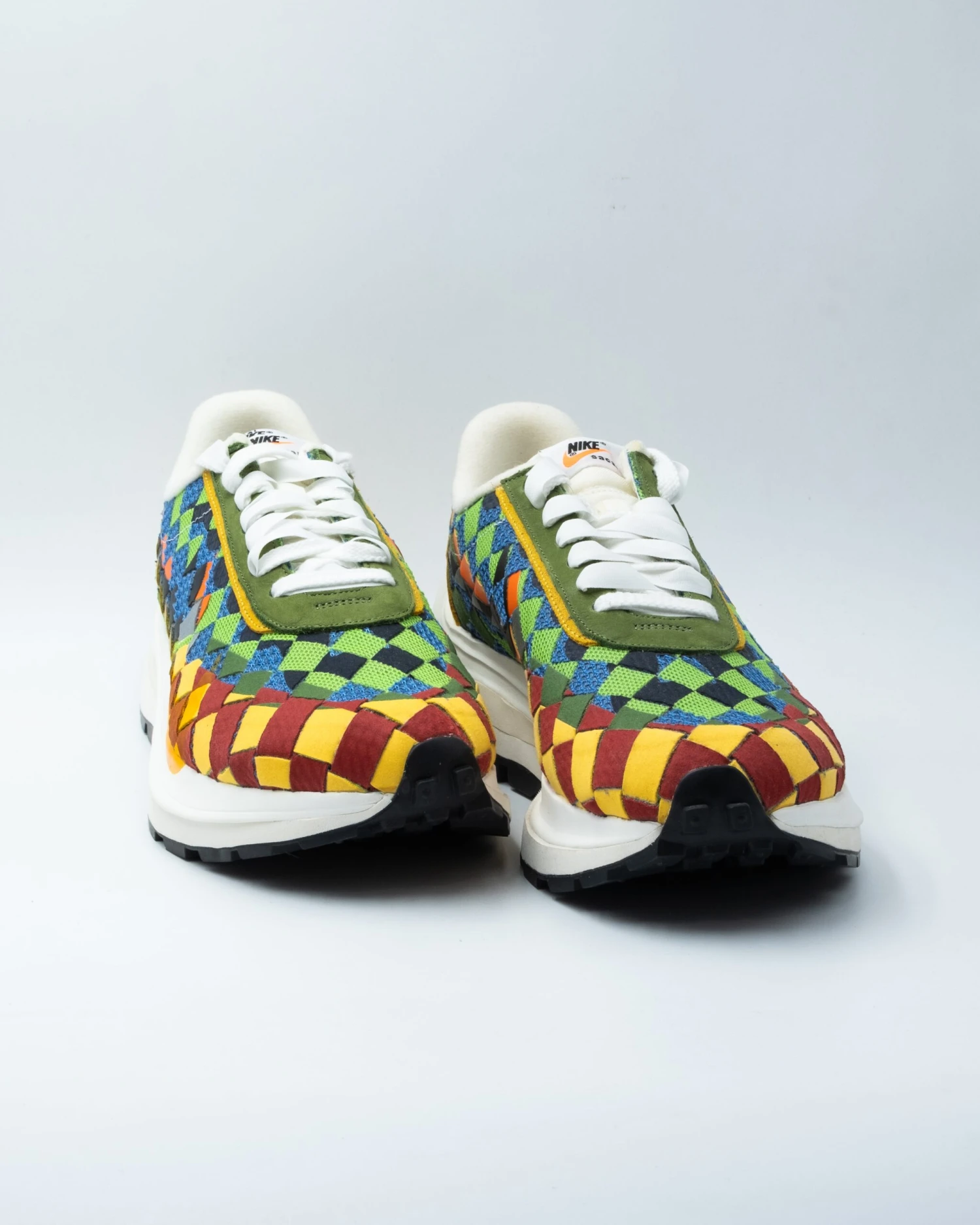La Nike VaporWaffle Woven sacai Jean Paul Gaultier Green Gusto est une chaussure issue d’une collaboration entre Nike, la marque japonaise de luxe sacai, et le designer français Jean Paul Gaultier. Cette version de la Nike VaporWaffle Woven est dotée d’une tige en tissu tressé façon panier. La majorité de la tige est verte, bleue, jaune et rouge. Le swoosh de Nike apparaît également sur chaque côté dans des combinaisons de couleurs astucieuses présentes dans le tissu tressé pour le faire ressortir, en noir, blanc et orange.