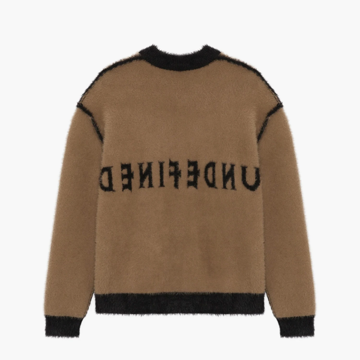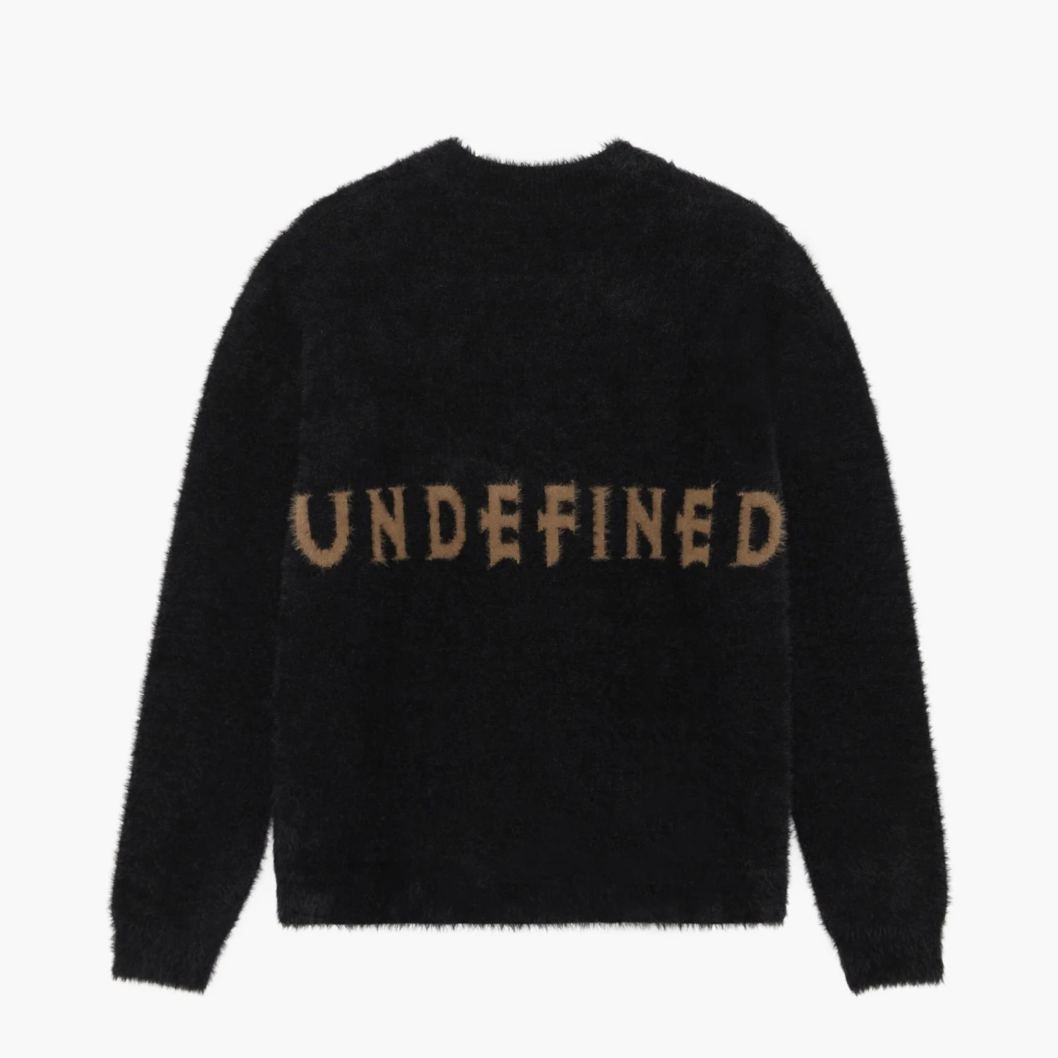 Le pull Undefined 1999 Knit Horizon Noir est un modèle en maille duveteuse, doux et confortable, conçu avec une coupe droite unisexe. Entièrement réversible, il offre deux looks distincts : un côté noir avec l’inscription contrastée « UNDEFINED » au dos et un logo « UF » brodé à l’avant, et un côté beige avec le même visuel inversé. Ce design malin permet de varier les styles tout en gardant une esthétique forte et contemporaine. Les finitions côtelées au col, poignets et bas du pull assurent maintien et structure. Idéal pour un vestiaire streetwear haut de gamme et polyvalent.